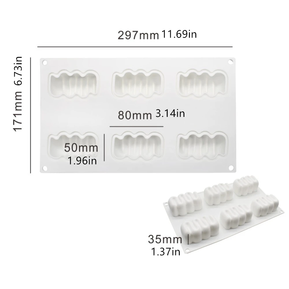 Материал: пищевой силиконРазмер: 29,7cmx17,1cmx3. 5 см/11,69inx6.73inx1.37inОдна Полость: 8cmX5cmX3.5 см/3.14inX1.96inX1.37in100% абсолютно новый и высококачественный, широкий диапазон температуры: -40 ~ 230C.Можно безопасно использовать в духовке, микроволновой печи, посудомоечной машине и холодильнике.Безвкусный, нетоксичный, пыленепроницаемый, прочный, не проникает и легко чистится.Подходит для изготовления льда своими руками, прост в использовании и прост в чистке