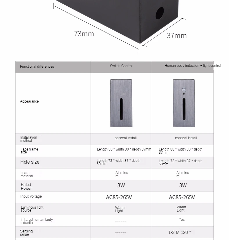 Размер: 88 мм * 35 мм * h35ммВырез: 73 мм * 33 мм * h45мм1. Гарантия: 2 года2.AC85-265V В переменного тока, 50-60 Гц.3.CREE LEDВысокое качество драйвер4.120-130lm/w5. Срок службы: 50000hurs выше6. Сертификация по ограничению на использование опасных материалов в производстве7. Индекс цветопередачи: Ra = 85 Коэффициент мощности: 90% выше8. Цвет по вашему запросу white6000-6500K, теплый white3000-3200K, красный, синий, зеленый, желтый и т. Д.10. Отгрузка: небольшой заказ экспресс dhl/fedex и т. Д., массовый по морю/воздуху, образец позволяет менее 2 кг все отправляются почтой