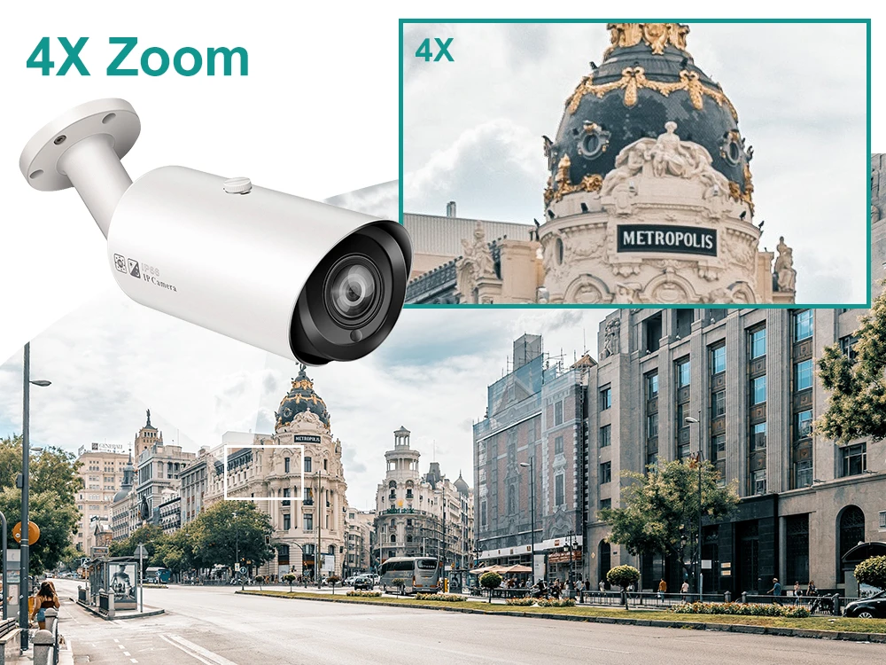 Эта камера с 4-кратным оптическим зумом, вы можете увеличивать изображение через приложение, чтобы видеть более четко, не приблизив и не увеличивая масштаб, чтобы получить более широкий обзор.