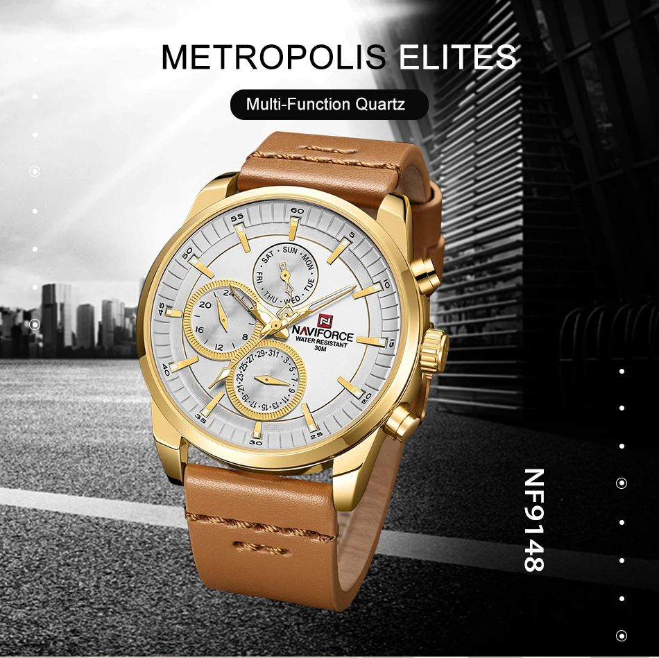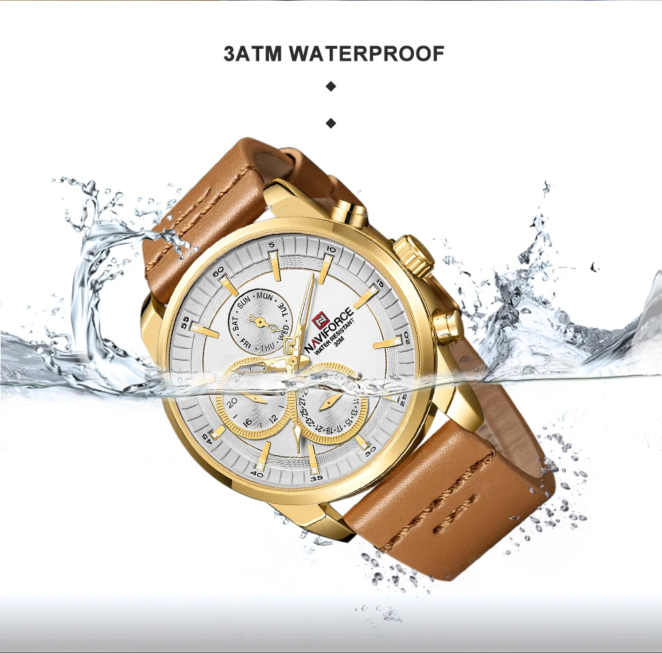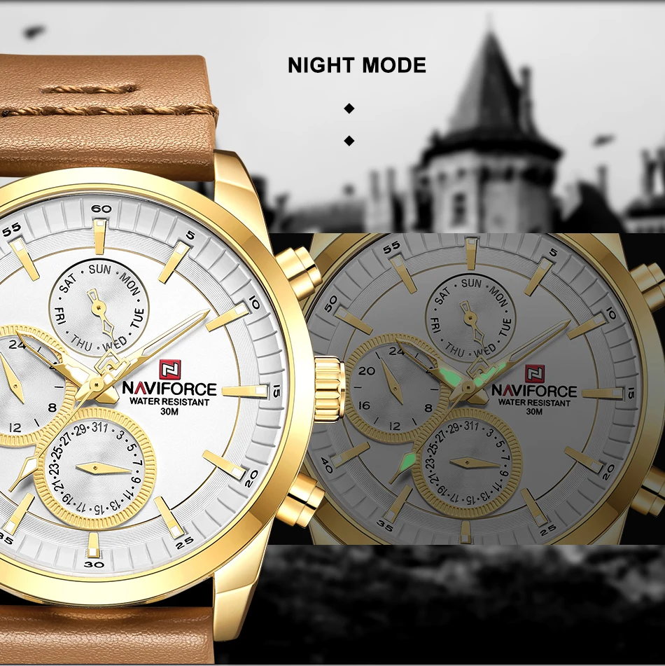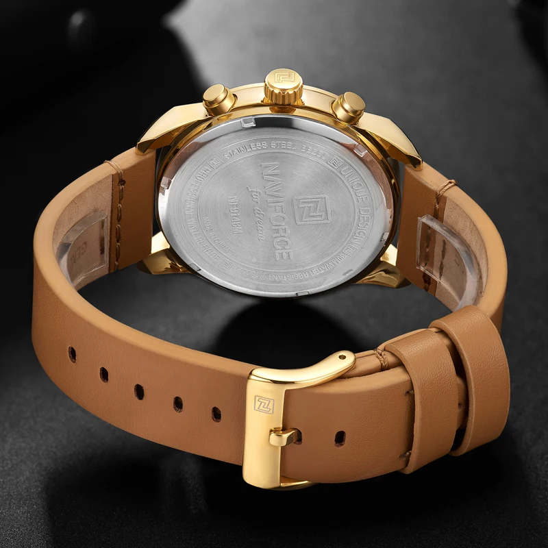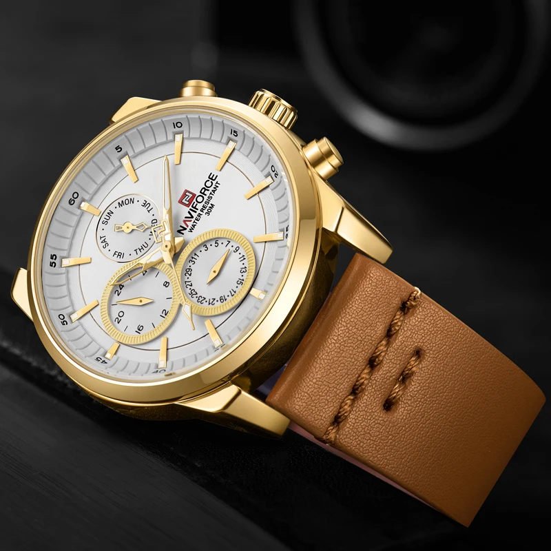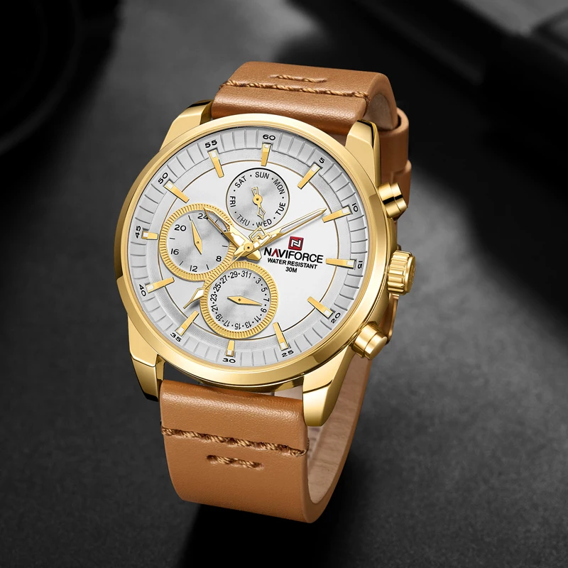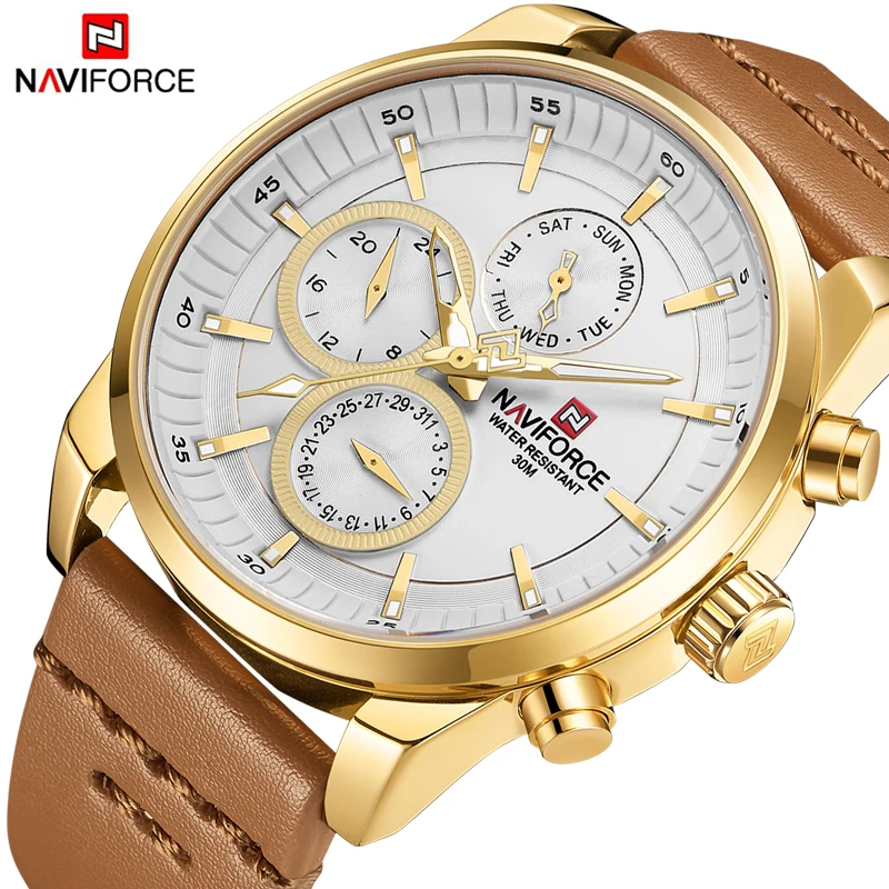 Часы NAVIFORCE Мужские кварцевые, водонепроницаемые, с кожаным реме...
