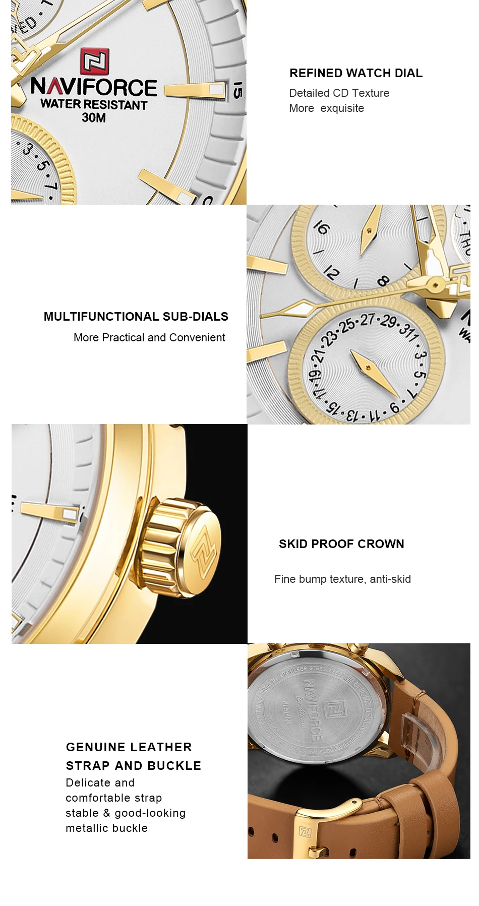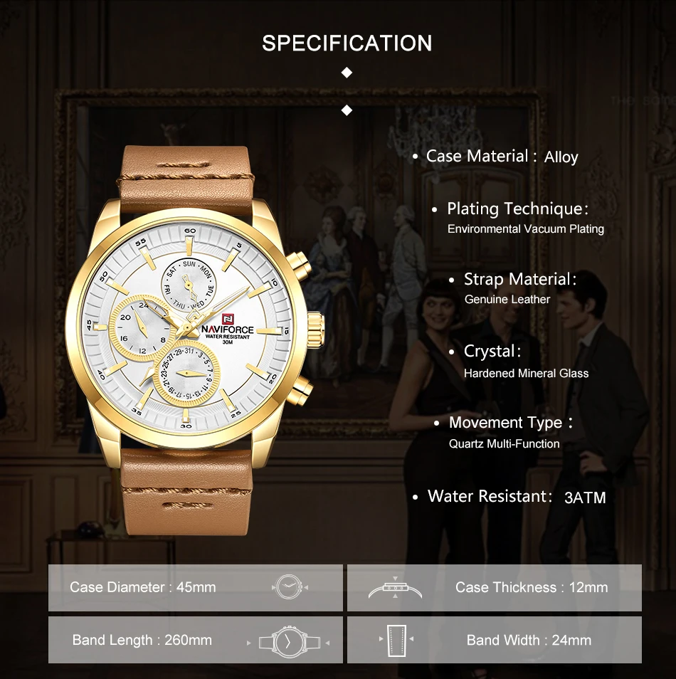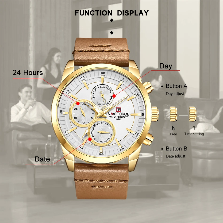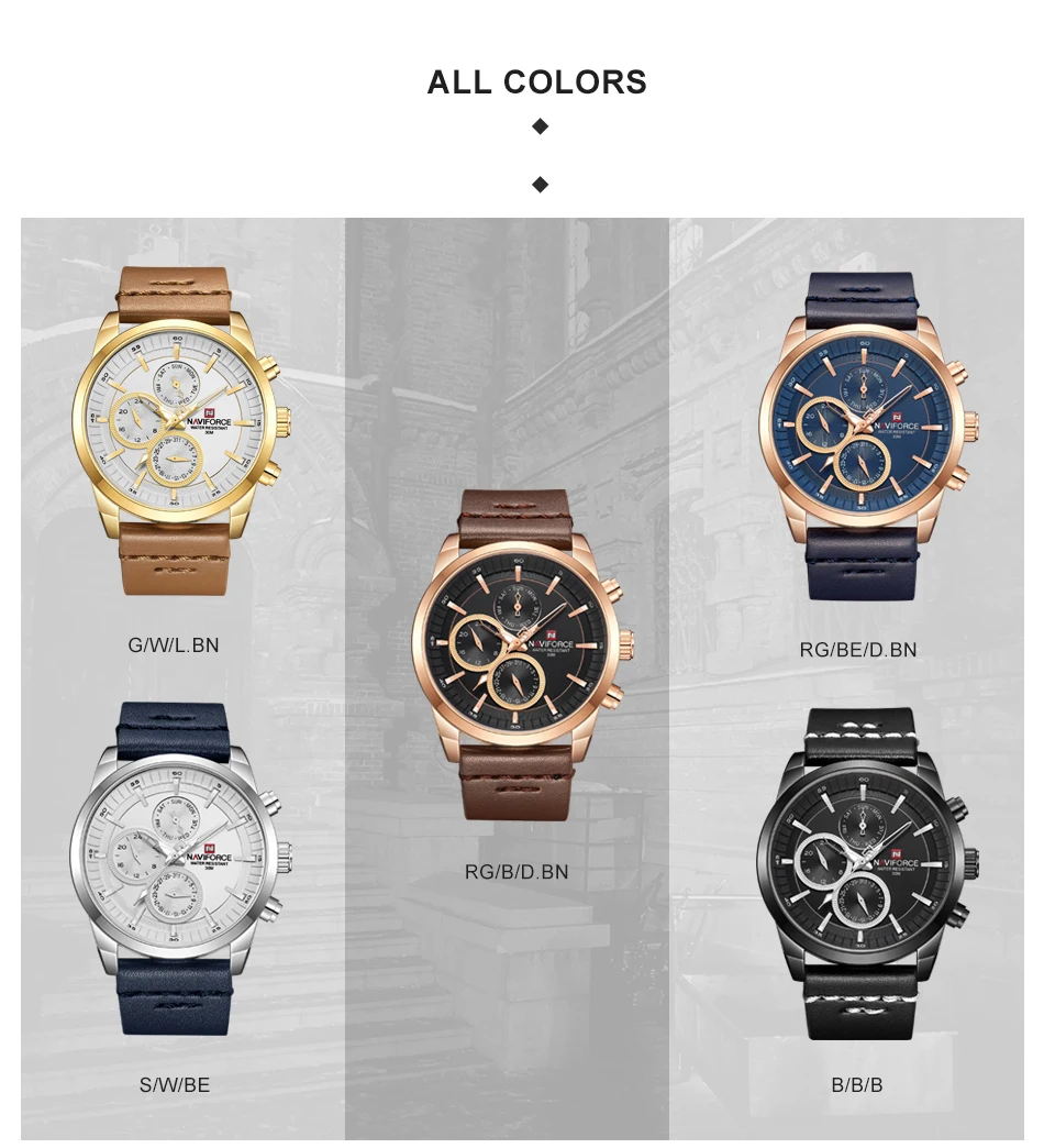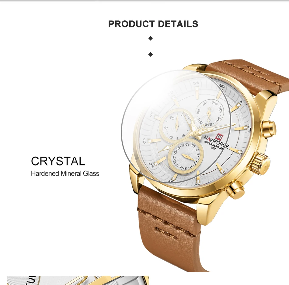 Часы NAVIFORCE Мужские кварцевые, водонепроницаемые, с кожаным реме...