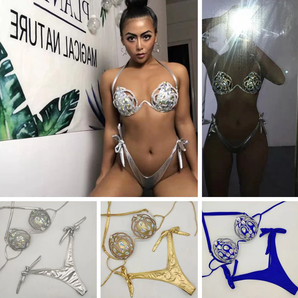 Комплект бикини с вырезами Женский, карнавальный бюстгальтер со стразами, пикантные трусики для ночного клуба, праздничный комплект бикини, костюм горящего мужчины, 3 цвета