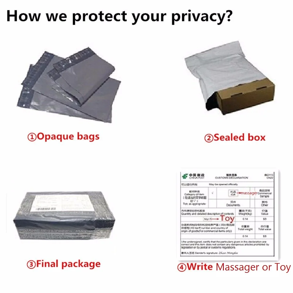 Для того чтобы защитить конфиденциальность клиента, упаковка не будет иметь никакой информации о продукте, только вы знаете, что внутри. Обычно мы декларируем имя «массажер» на таможне. Поэтому независимо от того, что вы покупаете, вы не имеете никакого смущения.