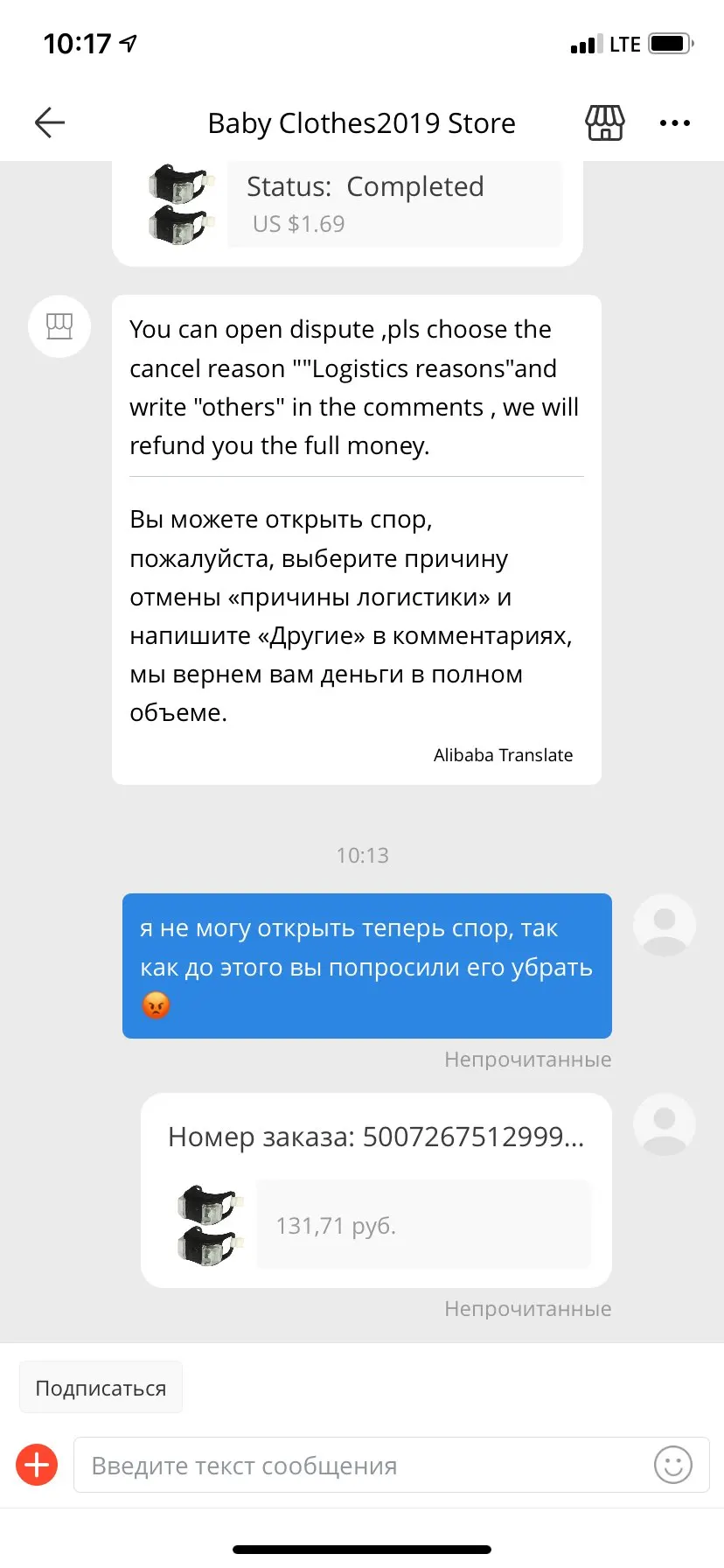 Товар не пришёл, на таможне застрял. Продавец хотел отправить повторно, нам через 2 месяца было неактуально, просила возврат средств, продавец отказал, просил спор сначала закрыть. В итоге через 3,5 месяца после заказа получила деньги, дождавшись решения спора от алиэкспресс