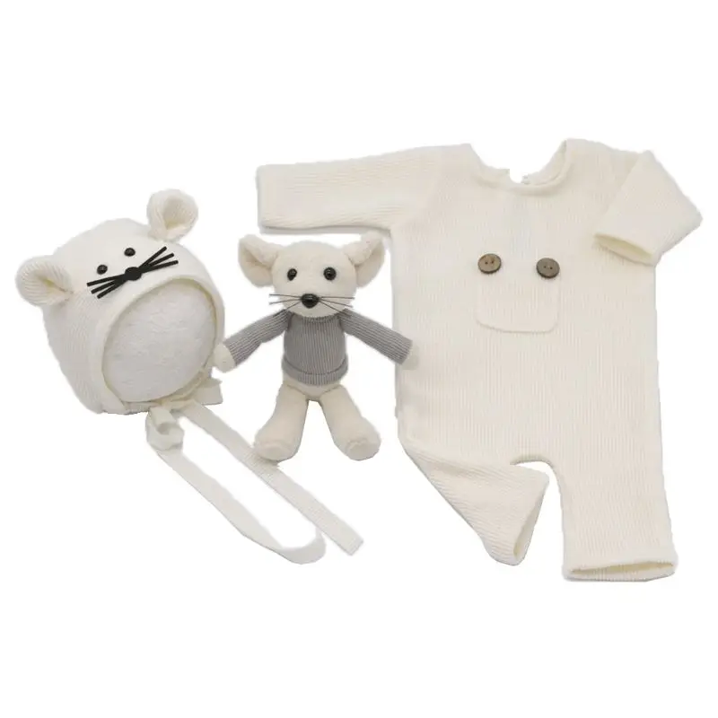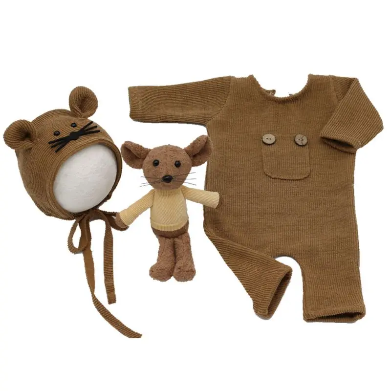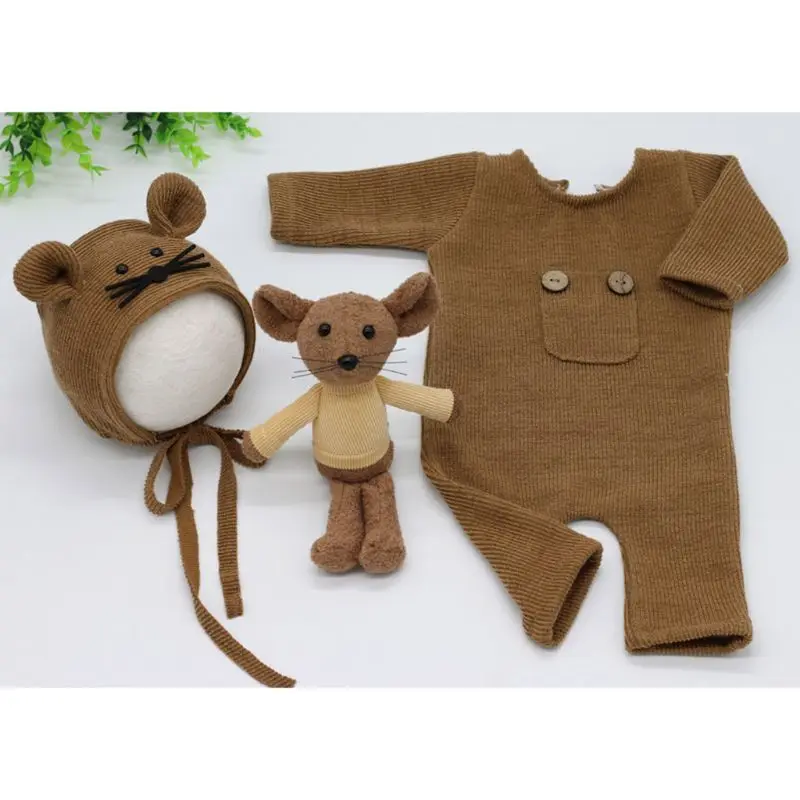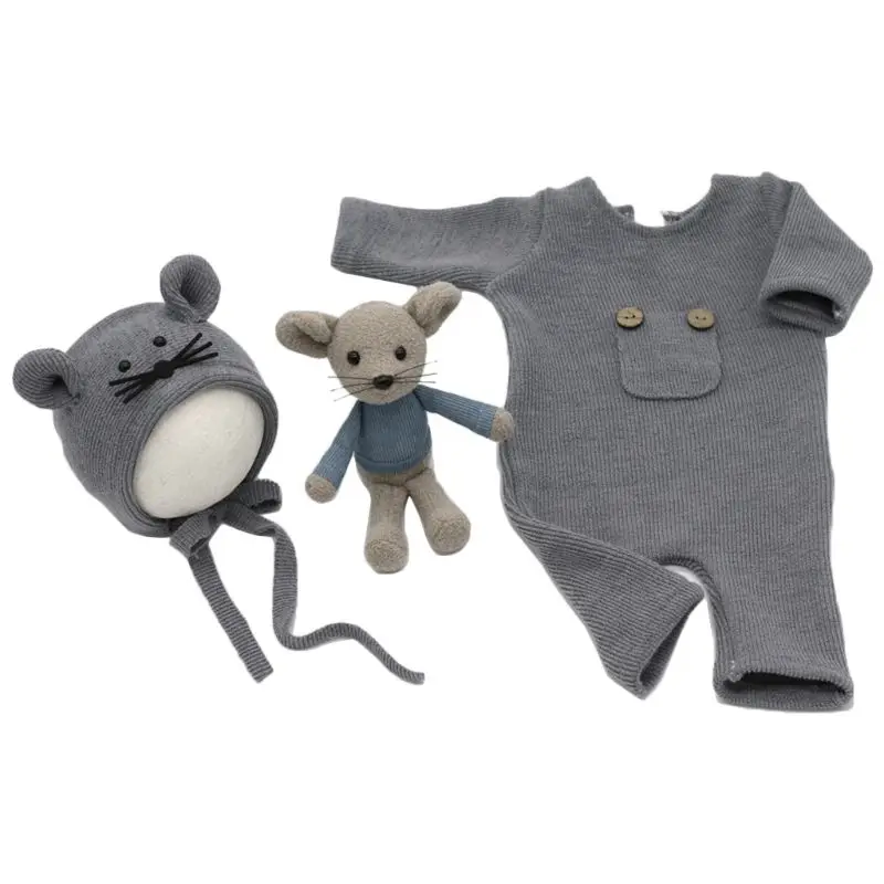 3 шт.компл. новорожденные фотографии реквизит костюм вязаный хлопковый комбинезон шапка кукла мышка P31B