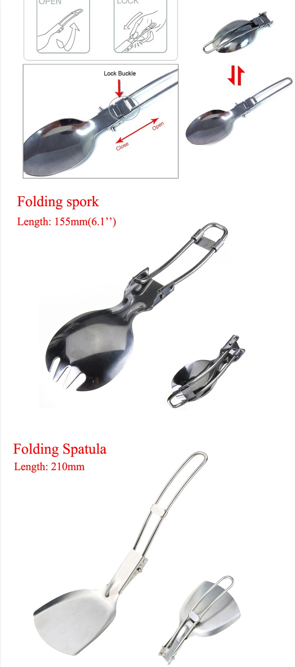 Выбор:A: 170 мм Spork с зубчатым резаком в стороне вилкиB: складные столовые приборы комбинированный набор (нож, ложка, вилка, нейлоновый мешок каждый 1 шт)C: 154 мм Складная ложка-вилкаD: 210 мм складной шпатель