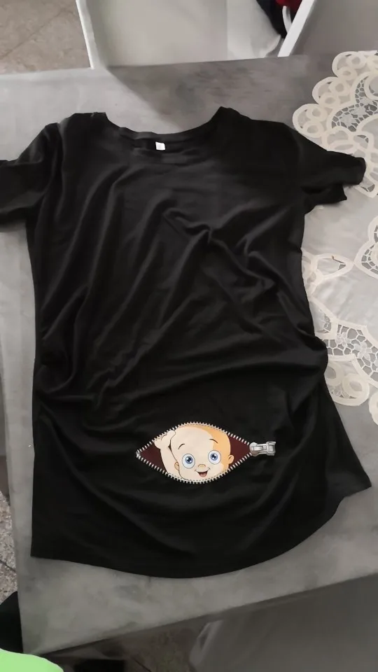 Camiseta de licra. Tacto suave. Queda larga, pero estando embarazada, mejor asi. Talla correcta. Muy bonita.