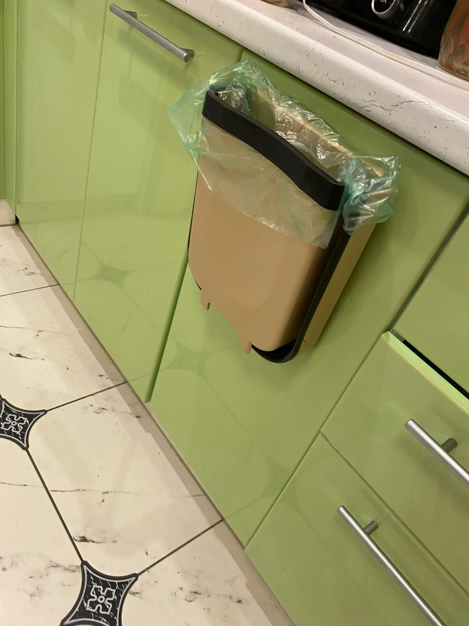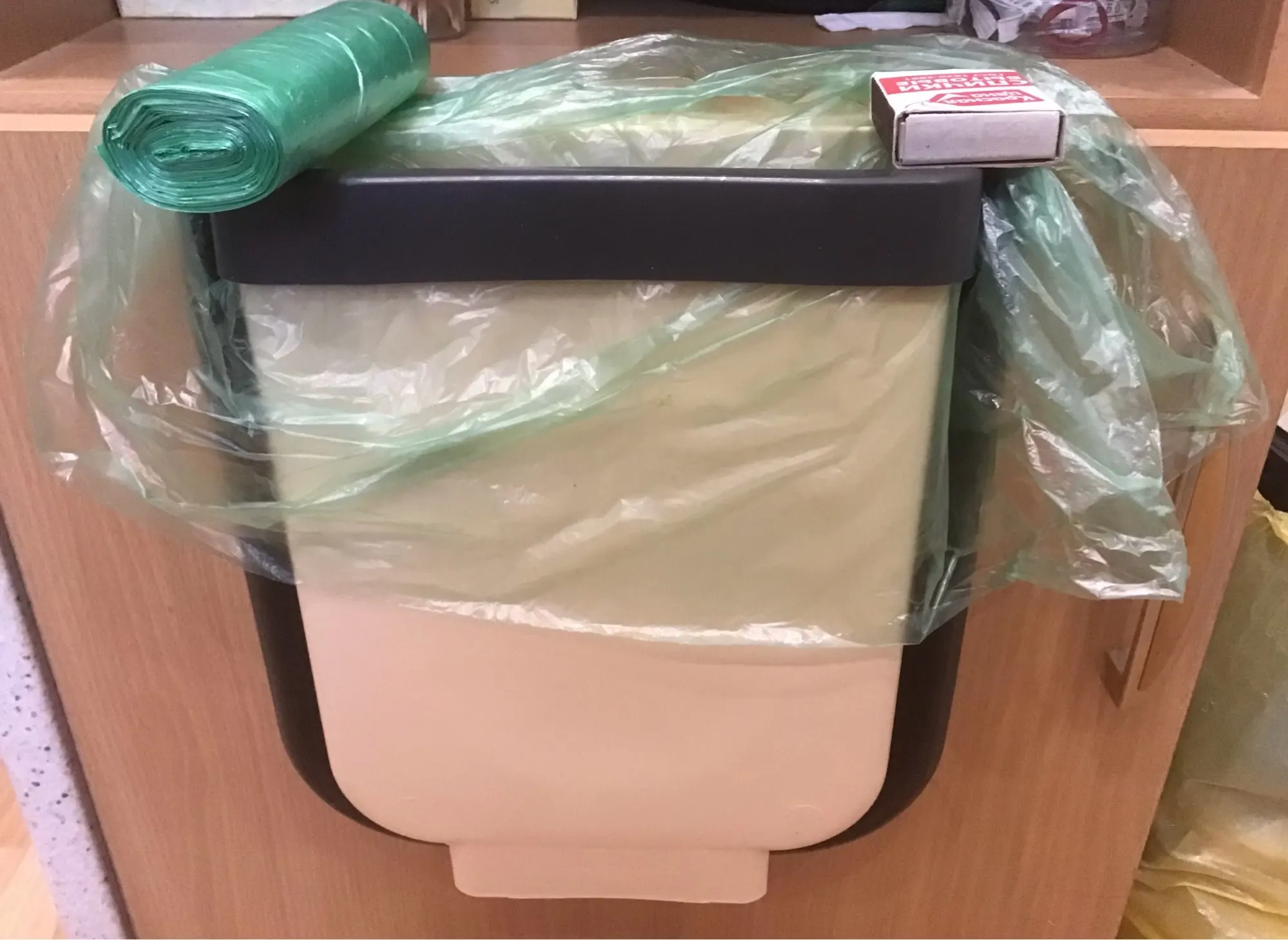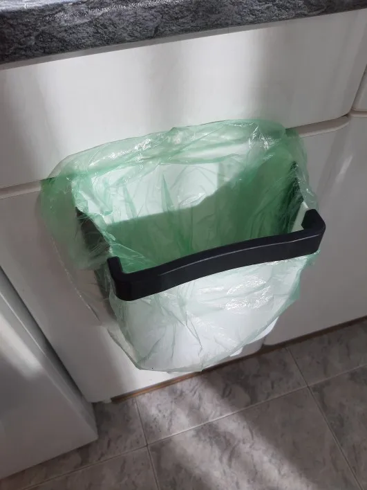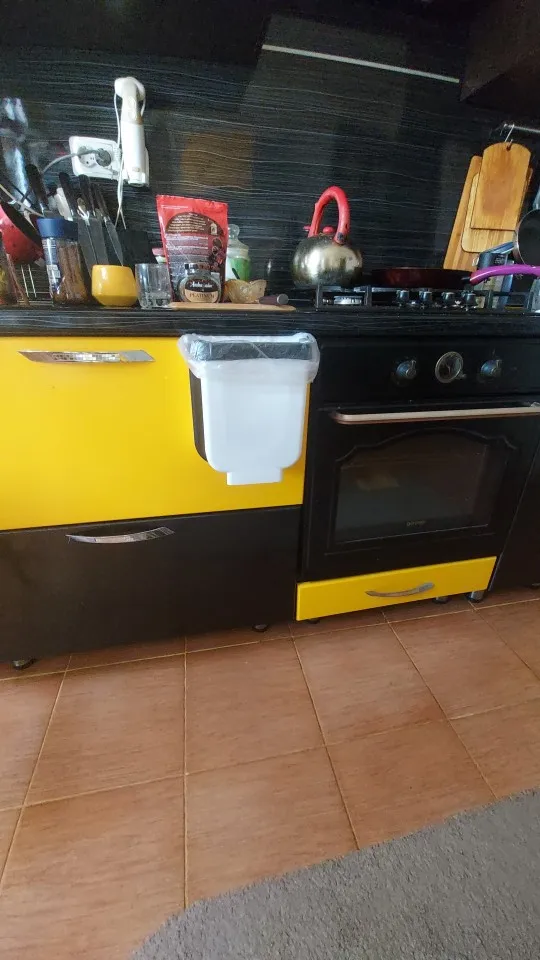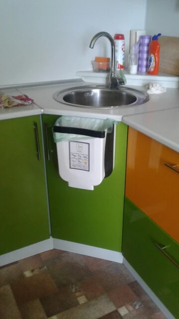 Отличная вещь. раньше я вешала пакет на ручки - было очень неудобно. теперь красота!. взяла самую маленькую ёмкость, чтобы не собирался мусор. положили ещё и пакетики. по цвету все вписалось.