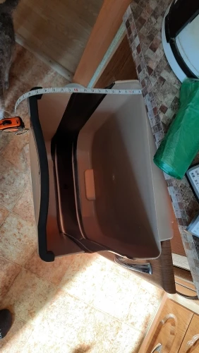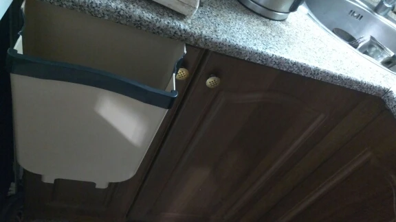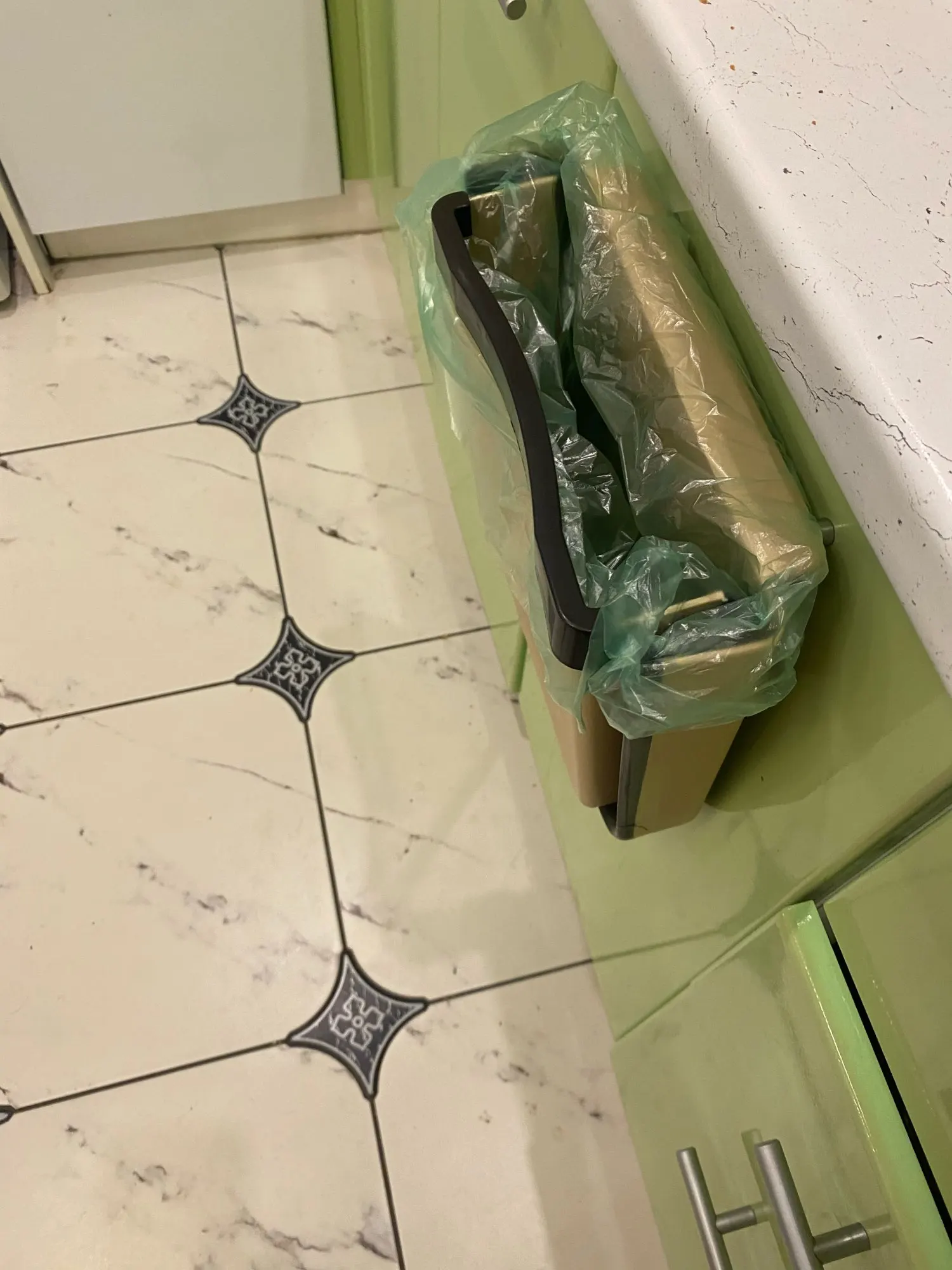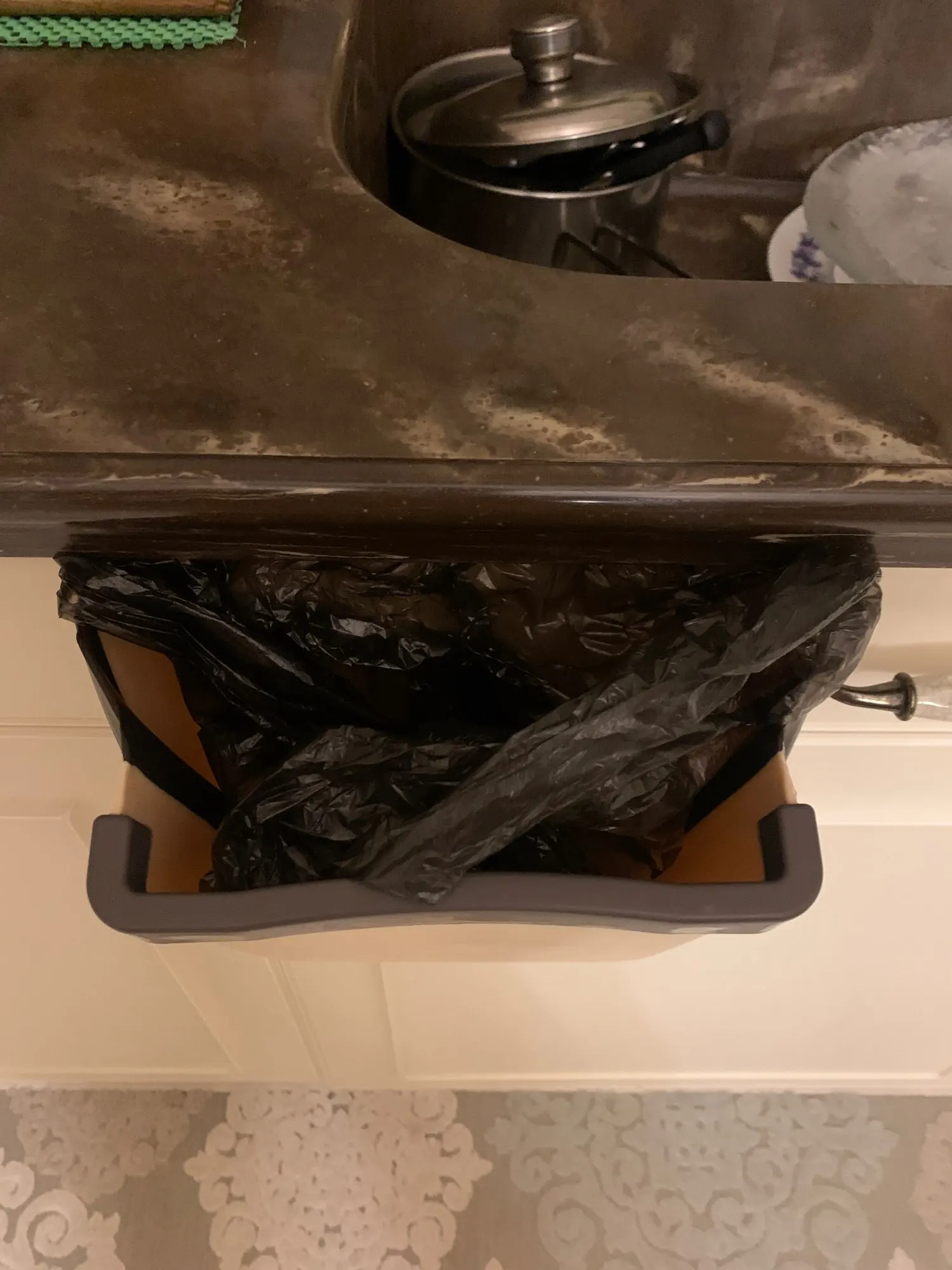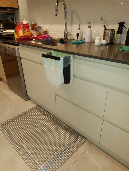 Отличная вещь. раньше я вешала пакет на ручки - было очень неудобно. теперь красота!. взяла самую маленькую ёмкость, чтобы не собирался мусор. положили ещё и пакетики. по цвету все вписалось.