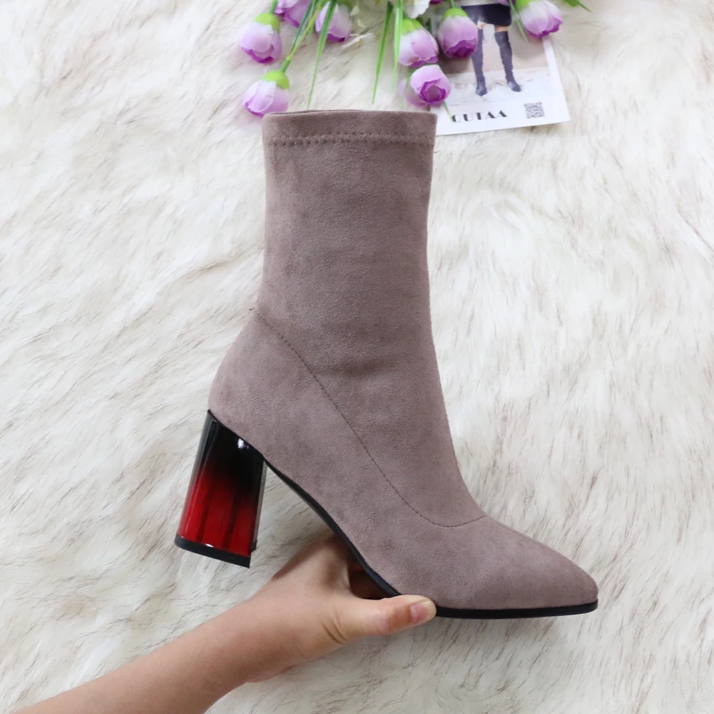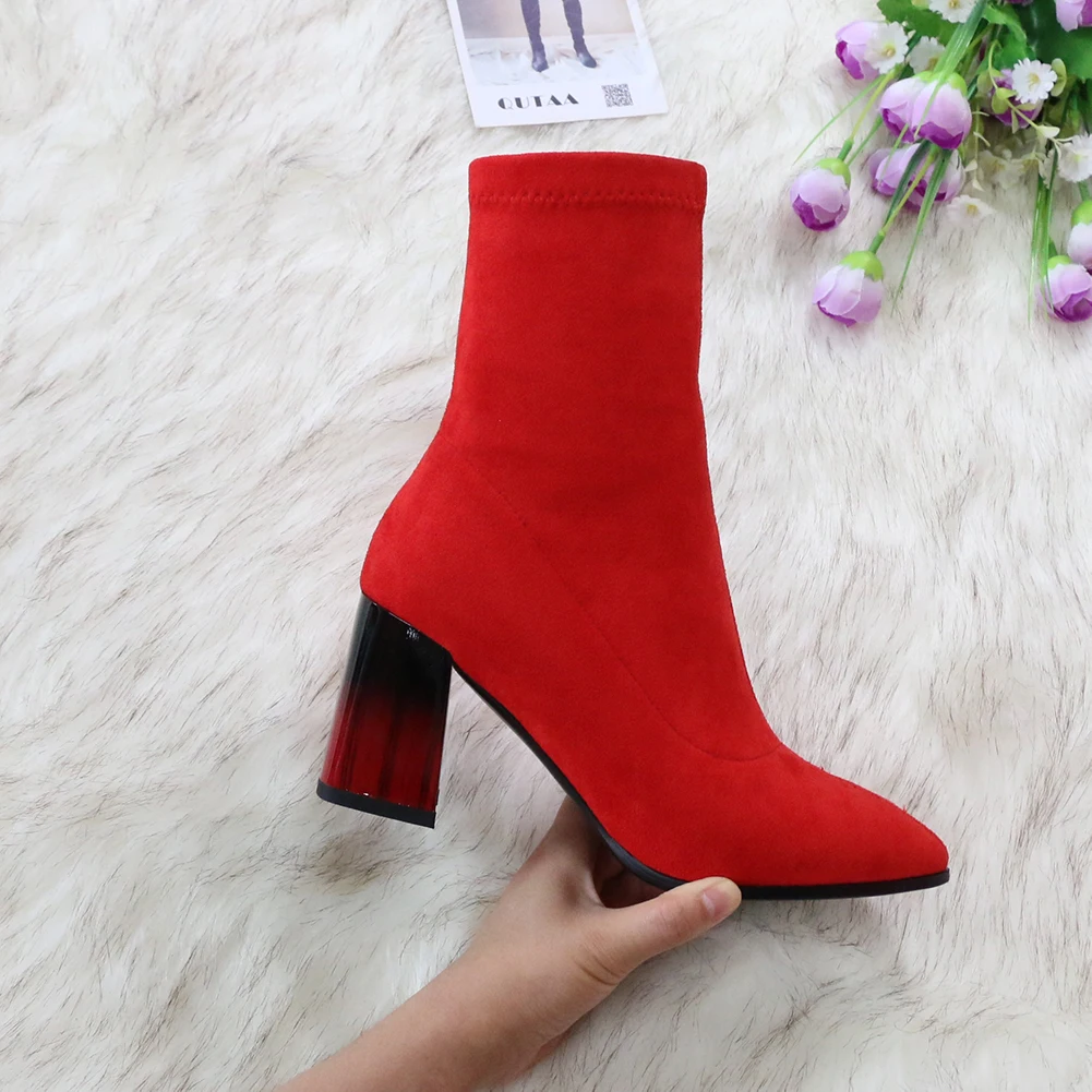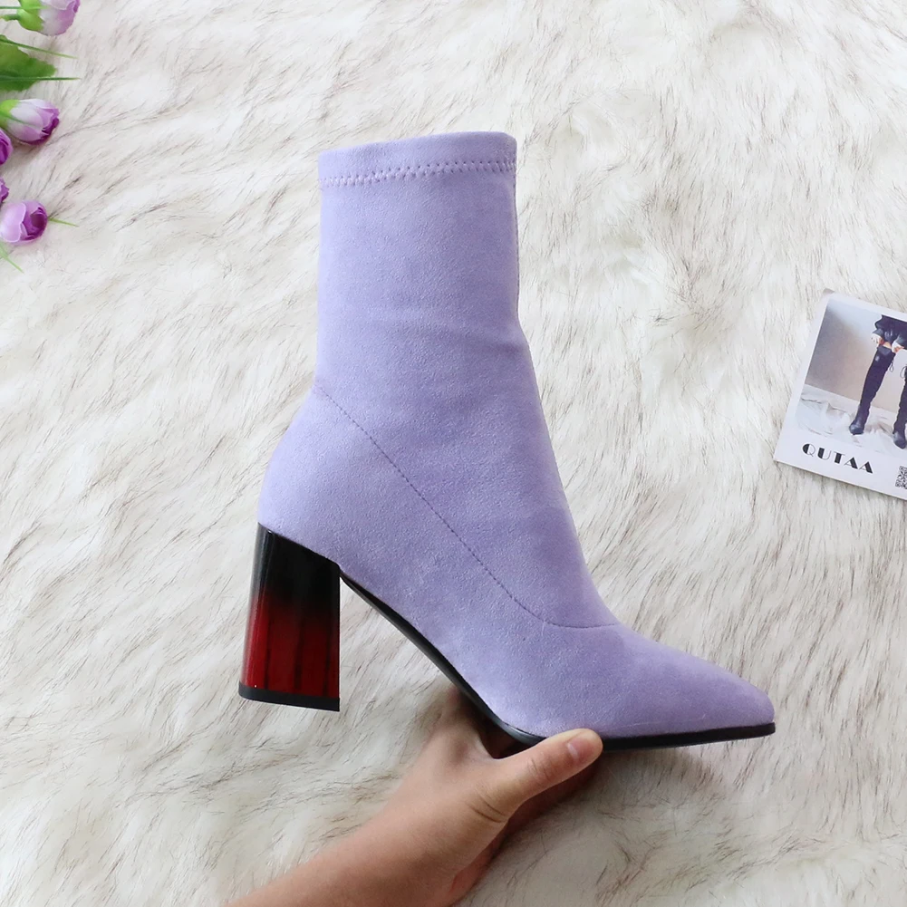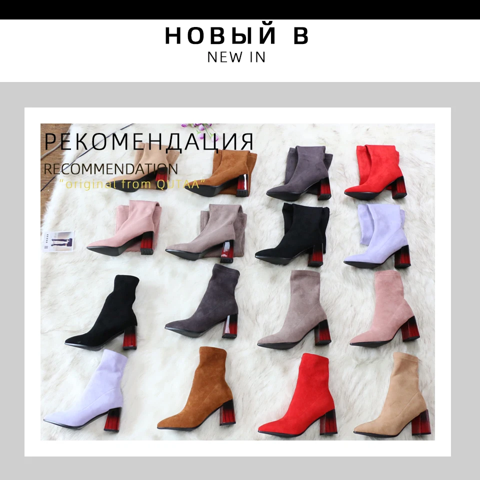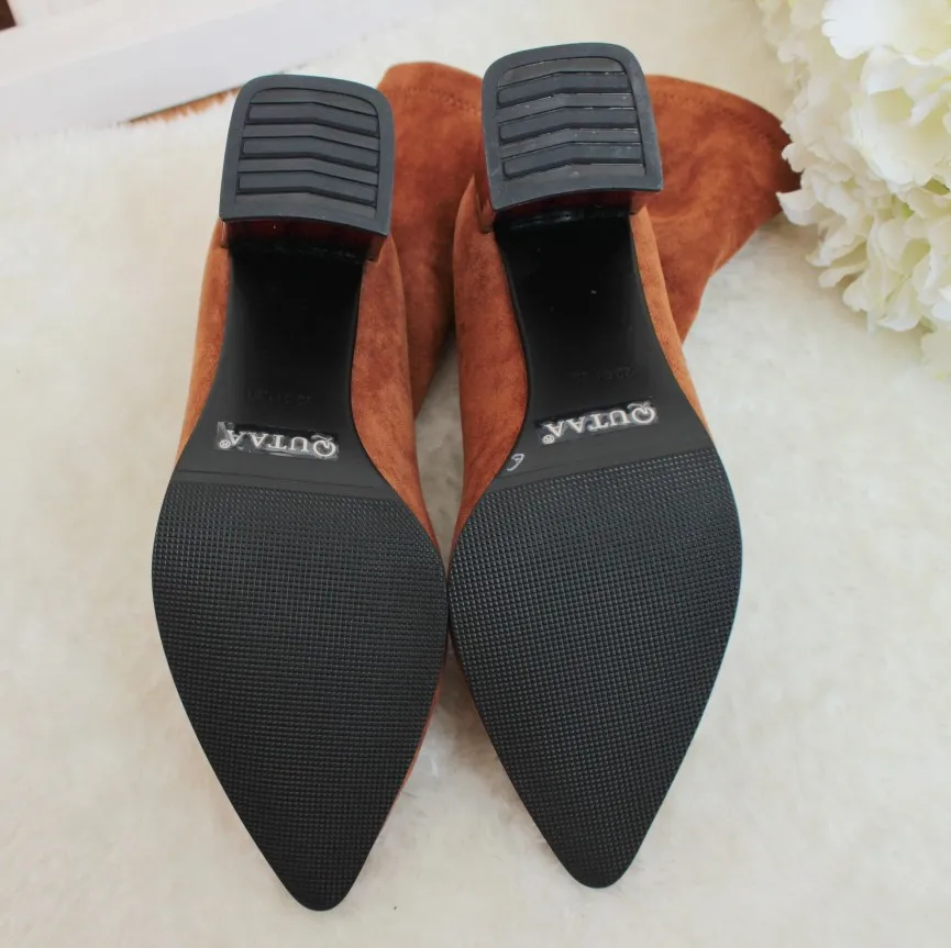 Женские сапоги выше колена QUTAA, черные эластичные сапоги из флока на высоком каблуке, с острым носком, размеры 34-43, для осени и зимы, 2021