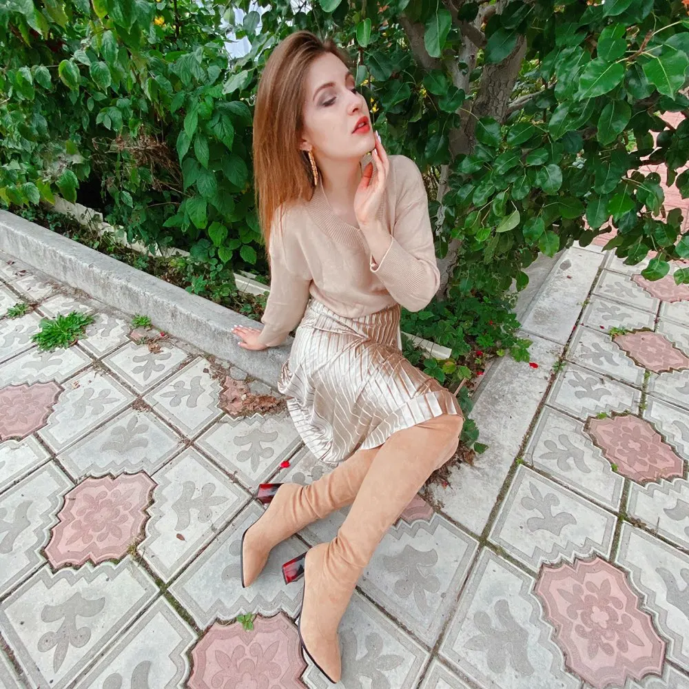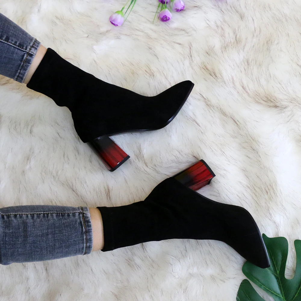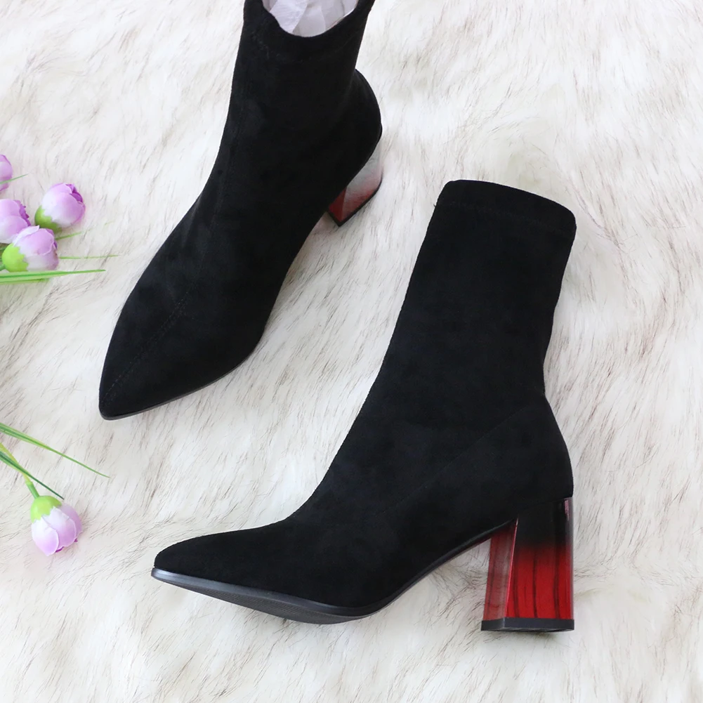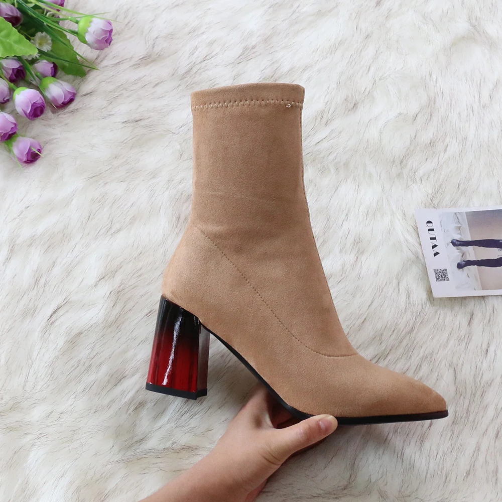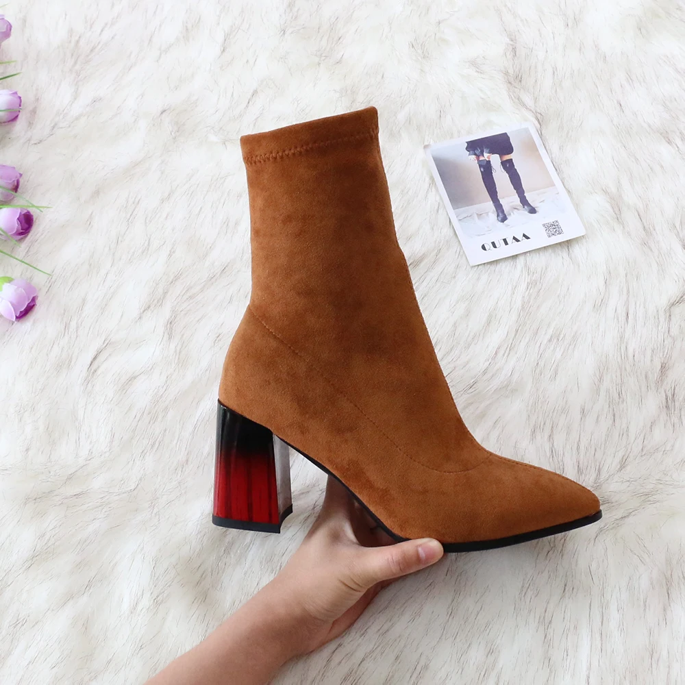 Женские сапоги выше колена QUTAA, черные эластичные сапоги из флока на высоком каблуке, с острым носком, размеры 34-43, для осени и зимы, 2021