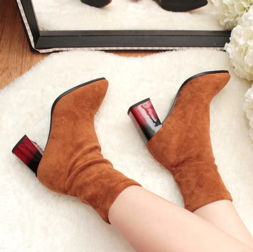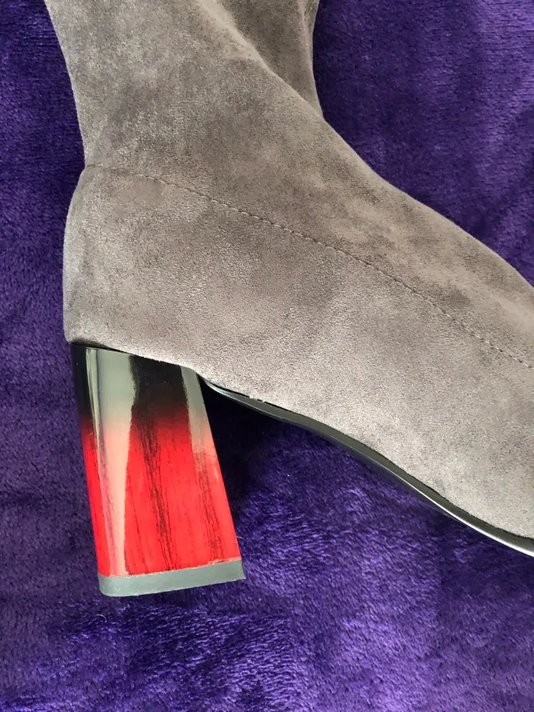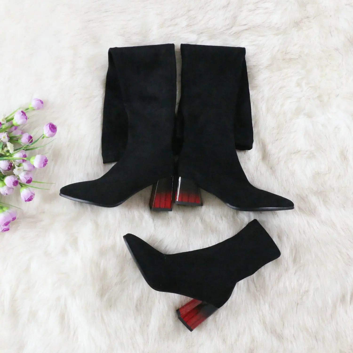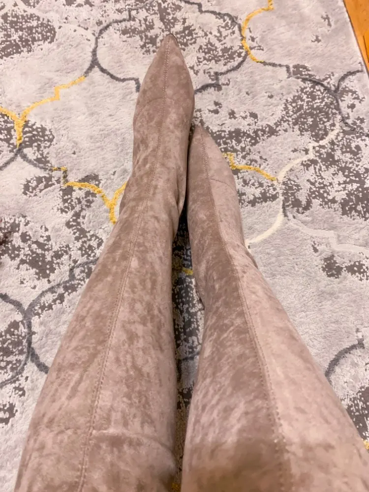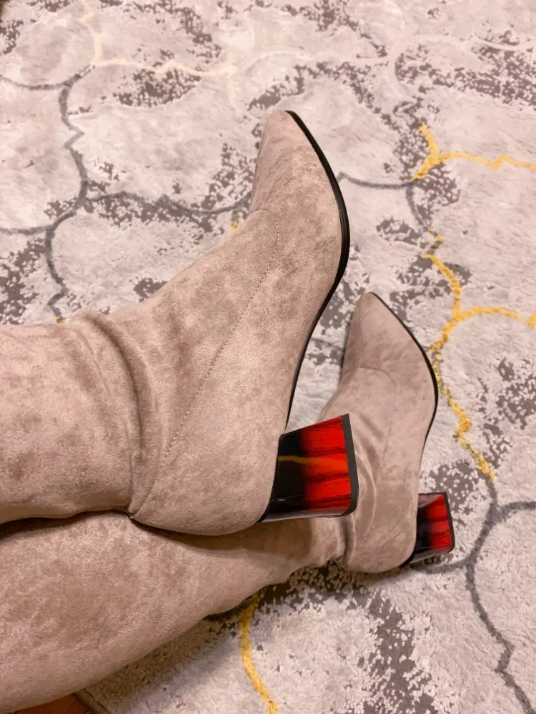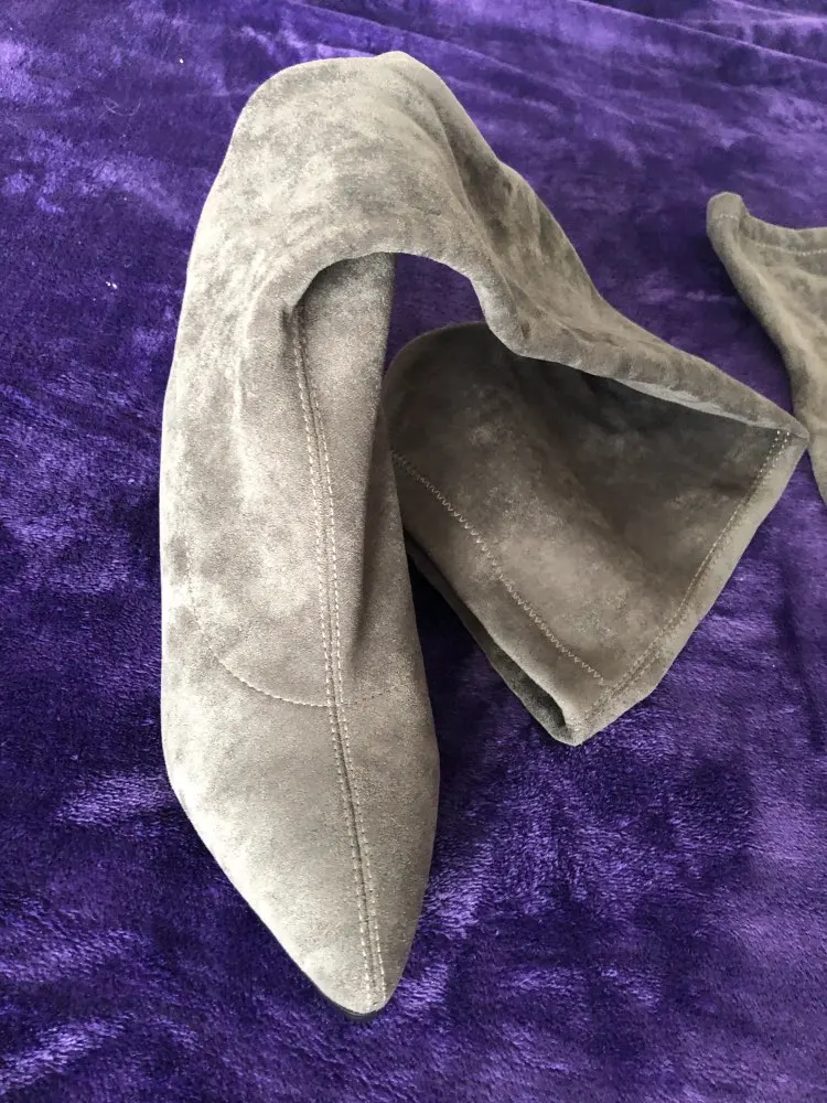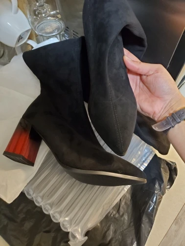 Это мой любимые Сапоги! ●Сапоги пришли в пыльнике, внутри пенопластовые вставки. ●Материал флок, имитирует замшу. ●Каблук очень необычный, массивный, устойчивый, не тяжёлый и главное УДОБНЫЙ!! ●Высота каблука: 7,5 cm ●Застёжек нет, надеваються как чулки. ●На свой 37 размер взяла 8 размер продавца- идеально! ●Не ползут вниз на ноге, даже на мой худые ноги сидят плотно. ●Носок острый. ● Идеально смотриться с юбками и пальто. На сезон весна, осень. Качество отличное!