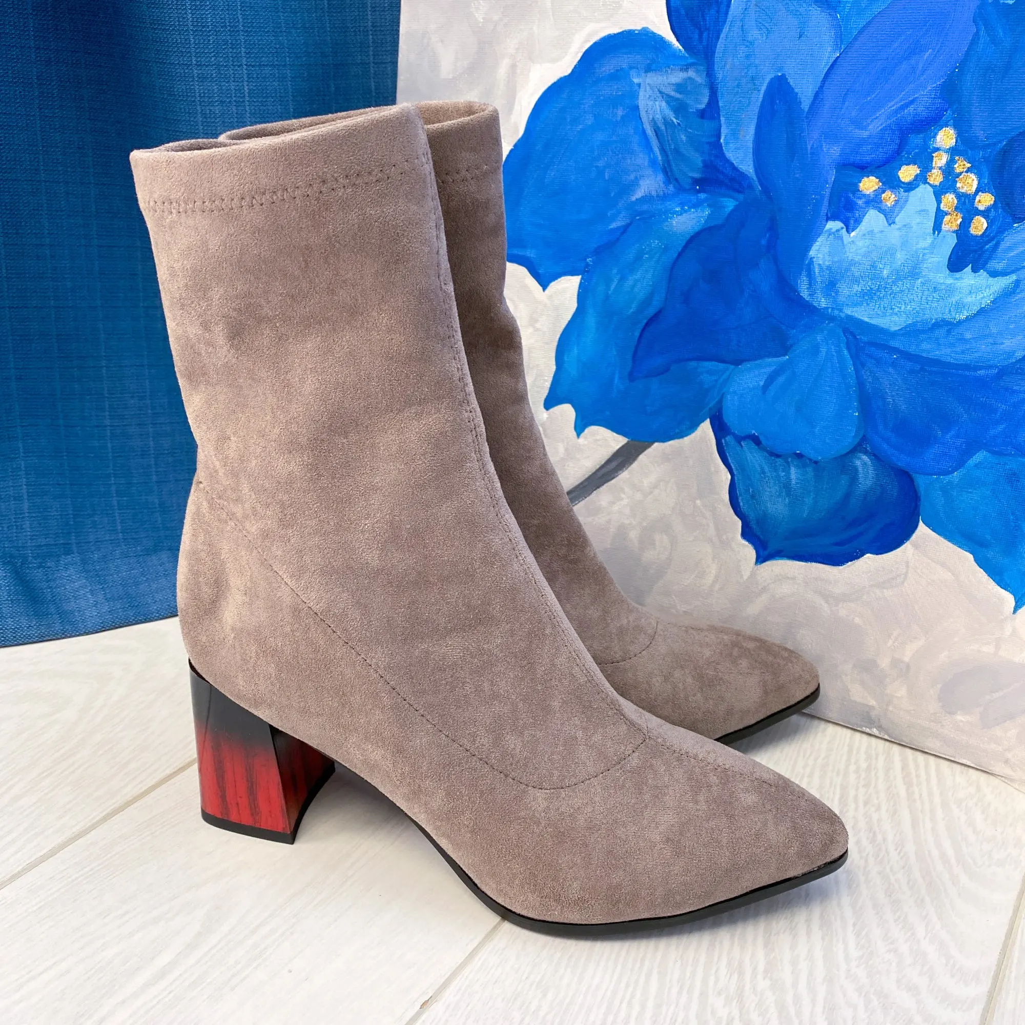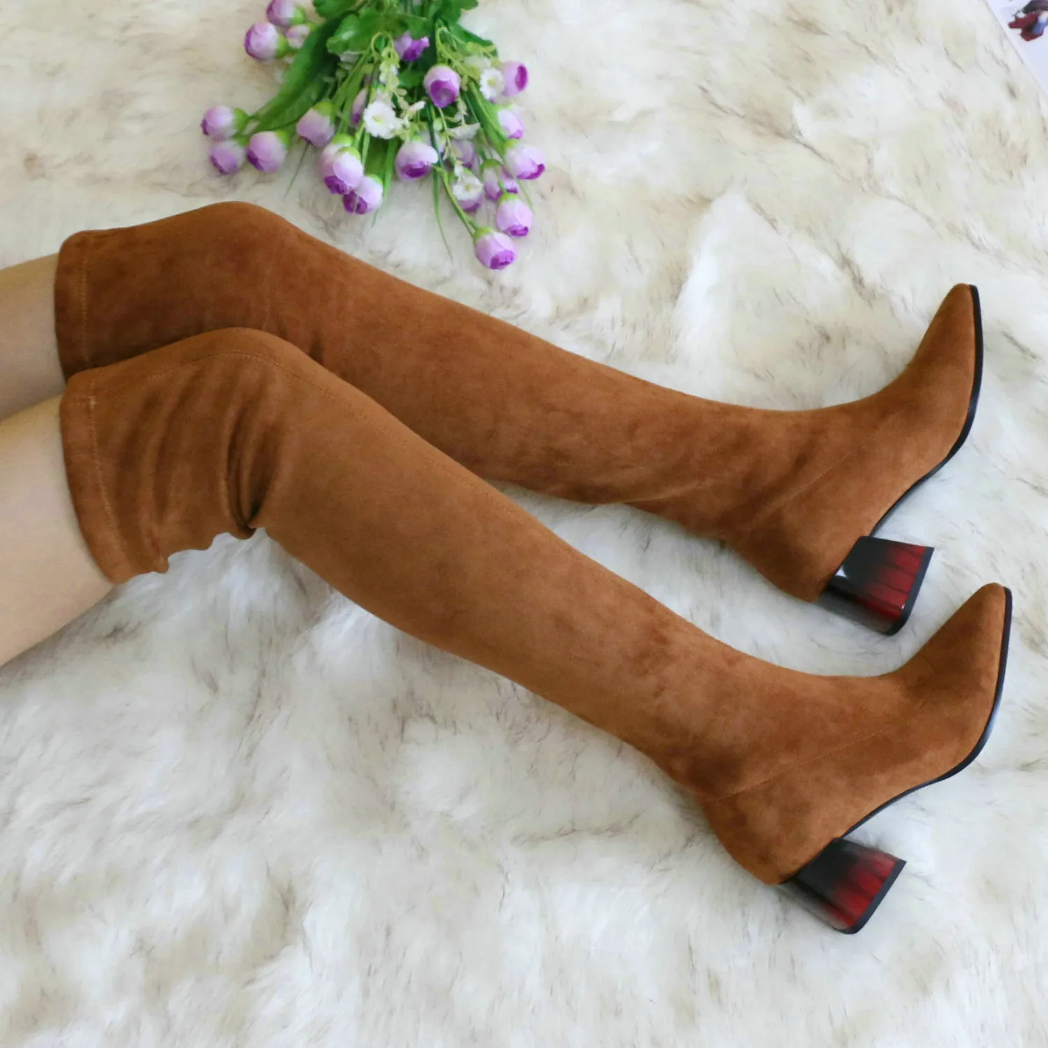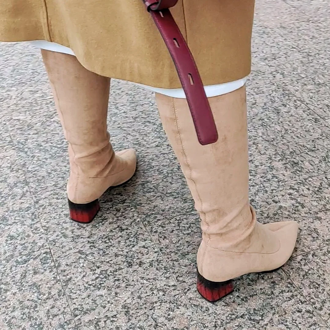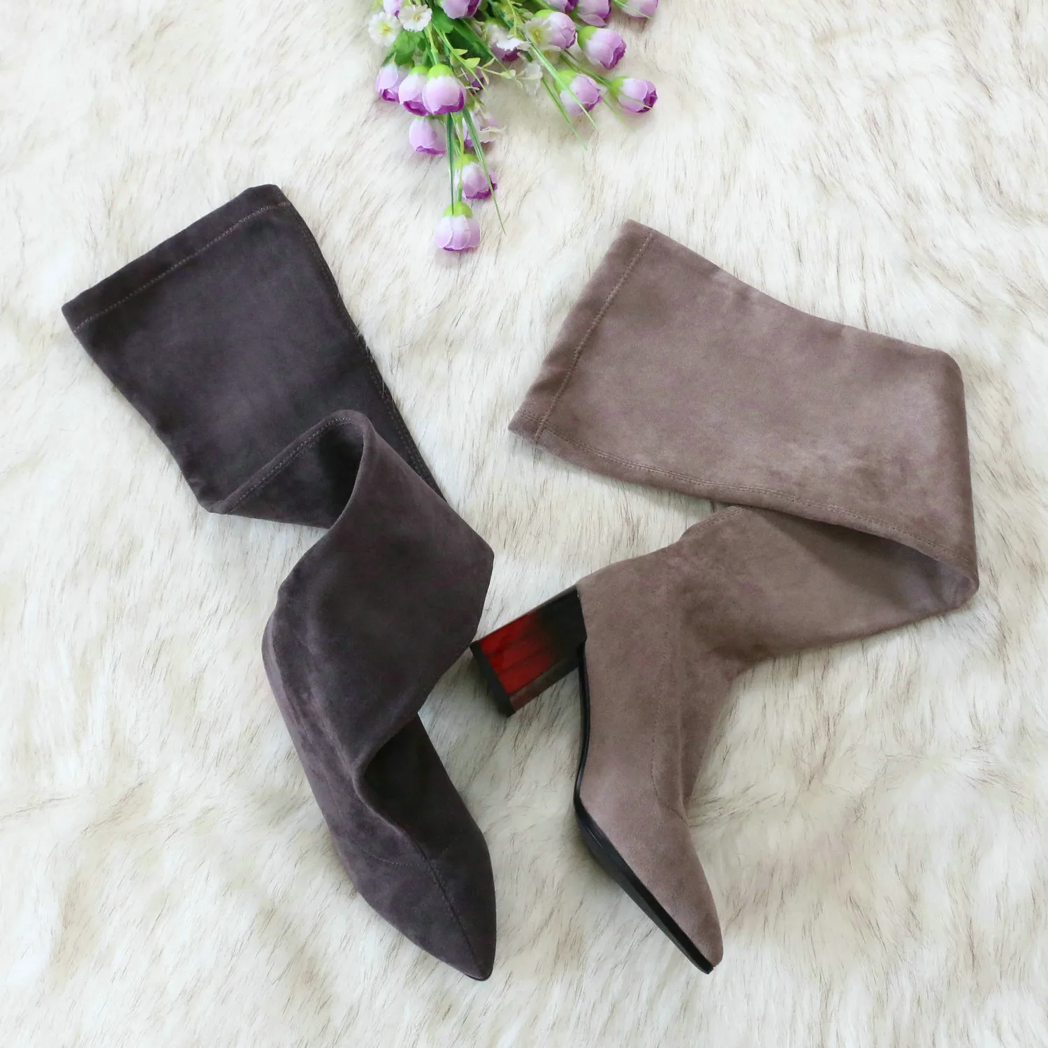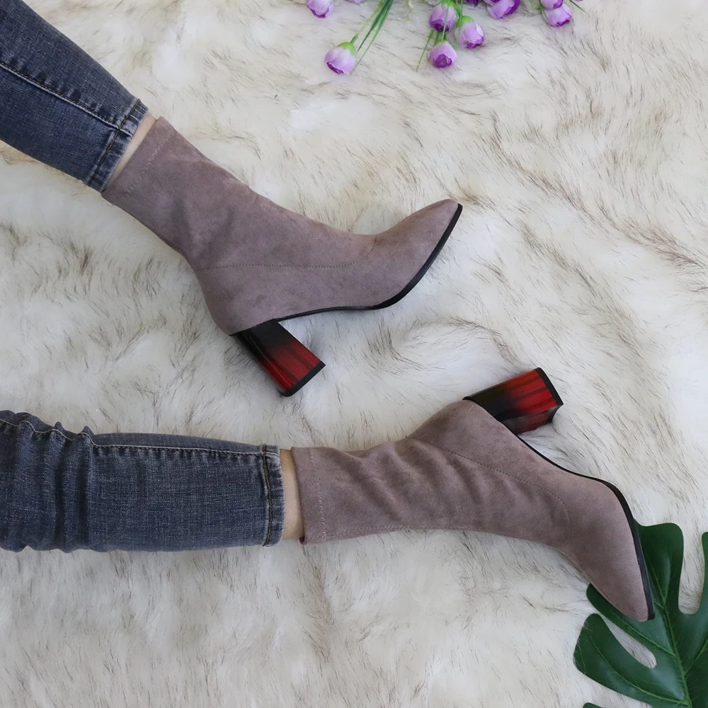 Это мой любимые Сапоги! ●Сапоги пришли в пыльнике, внутри пенопластовые вставки. ●Материал флок, имитирует замшу. ●Каблук очень необычный, массивный, устойчивый, не тяжёлый и главное УДОБНЫЙ!! ●Высота каблука: 7,5 cm ●Застёжек нет, надеваються как чулки. ●На свой 37 размер взяла 8 размер продавца- идеально! ●Не ползут вниз на ноге, даже на мой худые ноги сидят плотно. ●Носок острый. ● Идеально смотриться с юбками и пальто. На сезон весна, осень. Качество отличное!