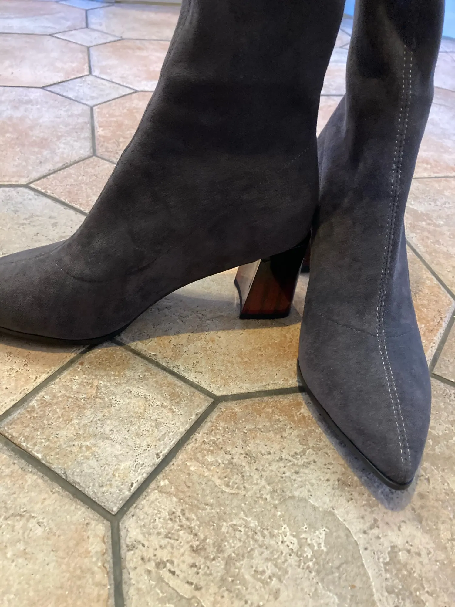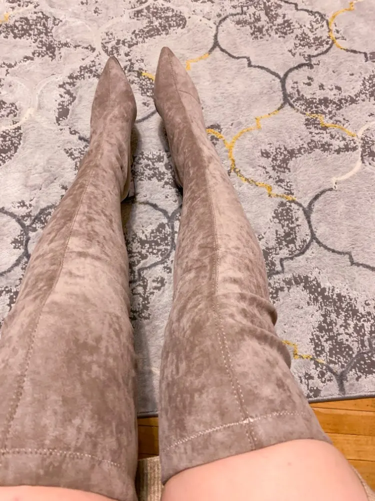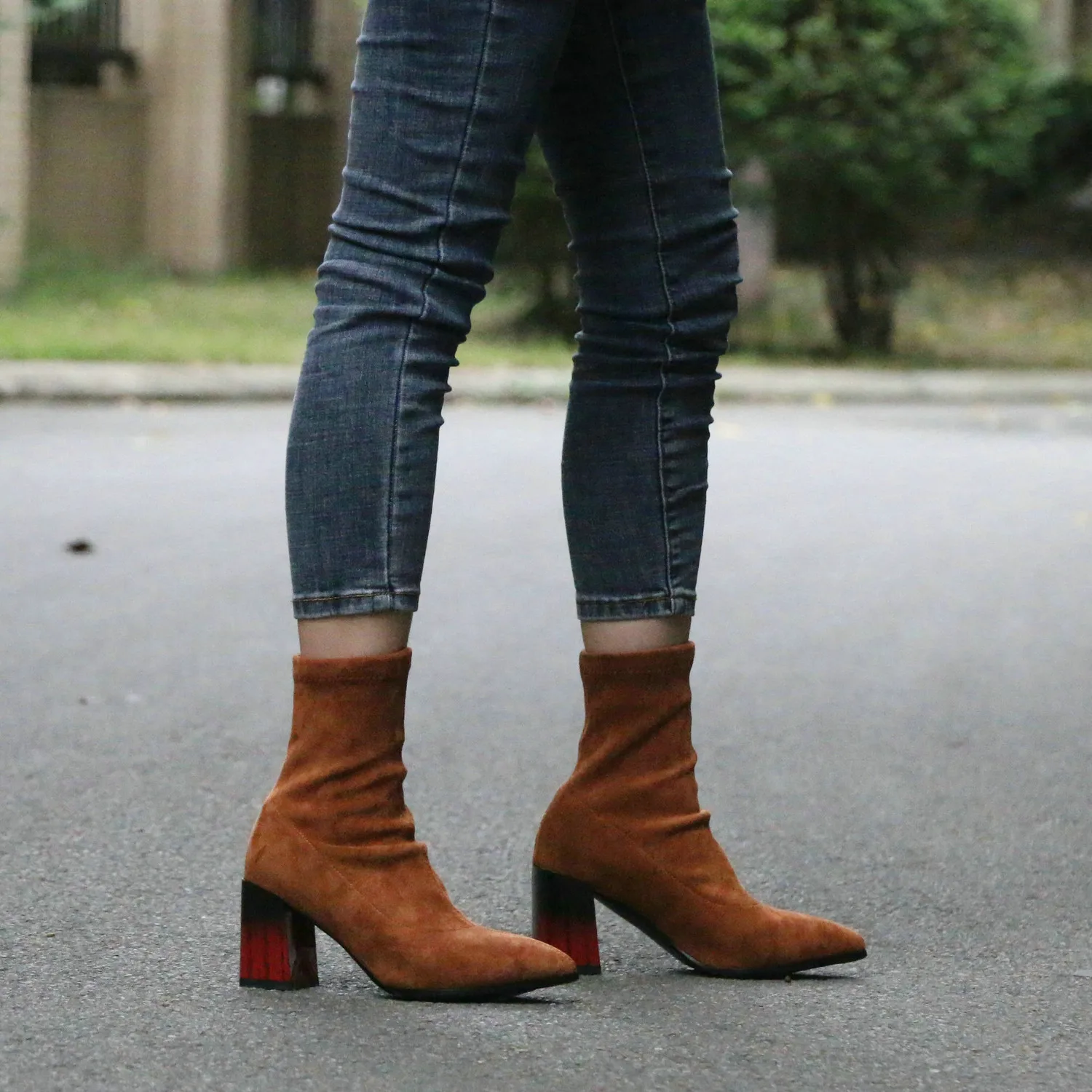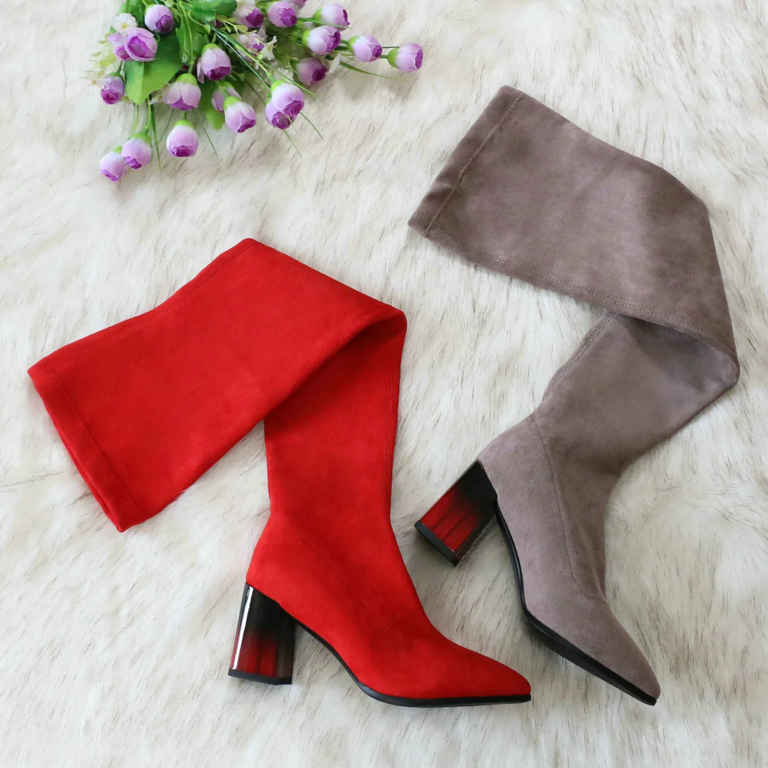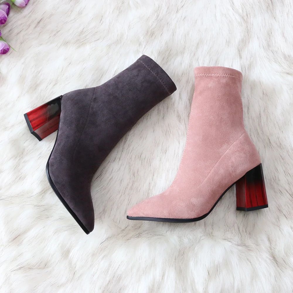 Это мой любимые Сапоги! ●Сапоги пришли в пыльнике, внутри пенопластовые вставки. ●Материал флок, имитирует замшу. ●Каблук очень необычный, массивный, устойчивый, не тяжёлый и главное УДОБНЫЙ!! ●Высота каблука: 7,5 cm ●Застёжек нет, надеваються как чулки. ●На свой 37 размер взяла 8 размер продавца- идеально! ●Не ползут вниз на ноге, даже на мой худые ноги сидят плотно. ●Носок острый. ● Идеально смотриться с юбками и пальто. На сезон весна, осень. Качество отличное!