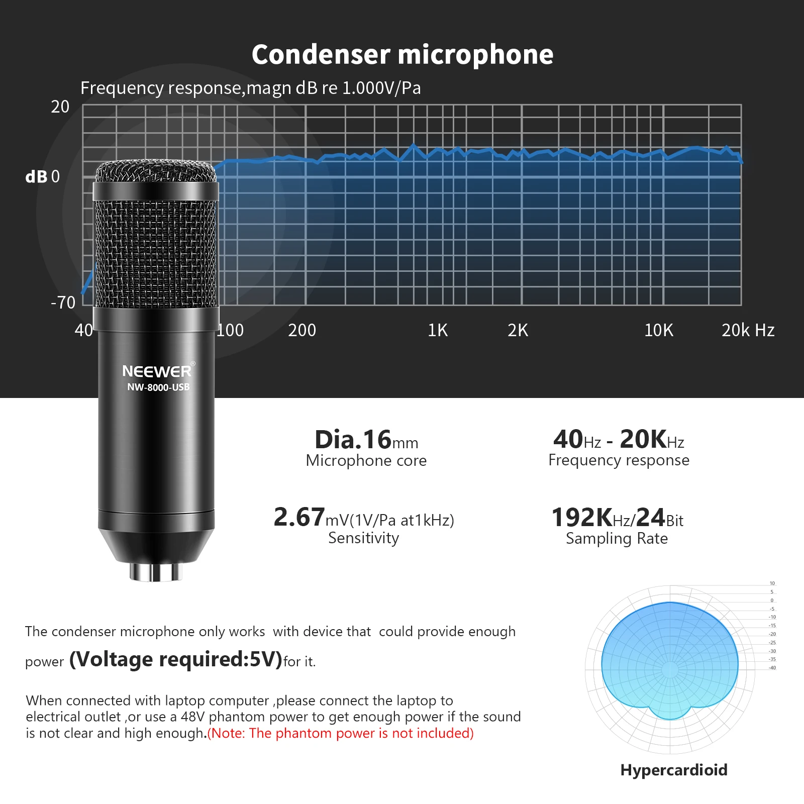 Neewer NW-8000 USB микрофон комплект, 192 кГц/24 бит Гиперкардиоидный конденсаторный микрофон с мониторные наушники, складывающаяся штанга микрофона поп-фильтр и амортизационной подвеской для пения, видеоблог, Подкаст, прямые трансляции