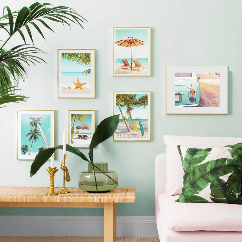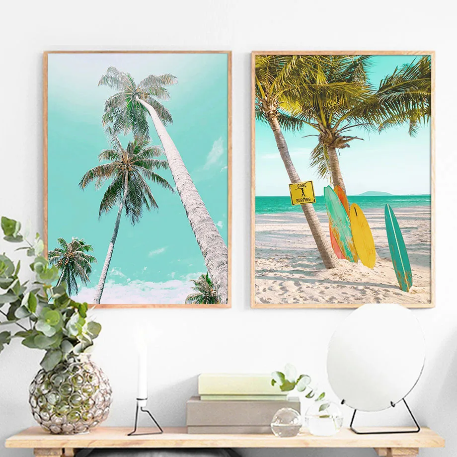 Розовая пляжная доска для серфинга, зонт, кокосовое дерево, настенн...