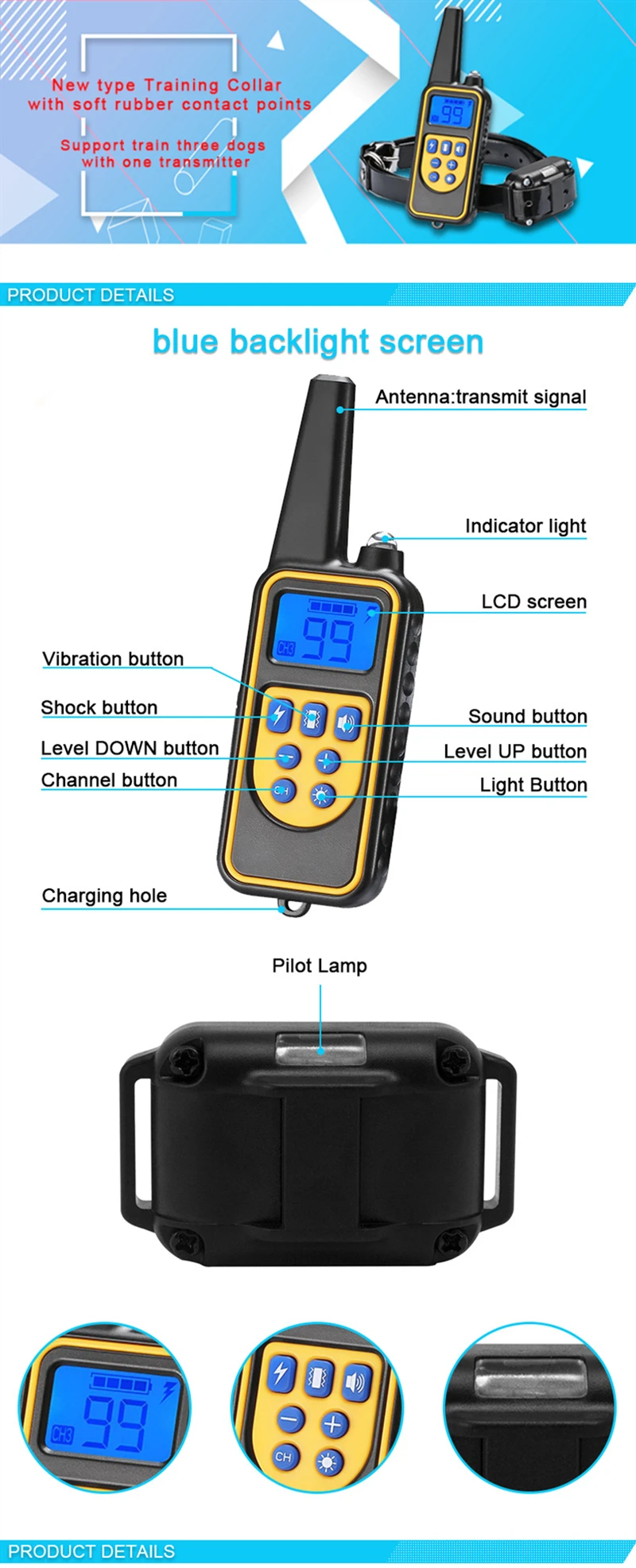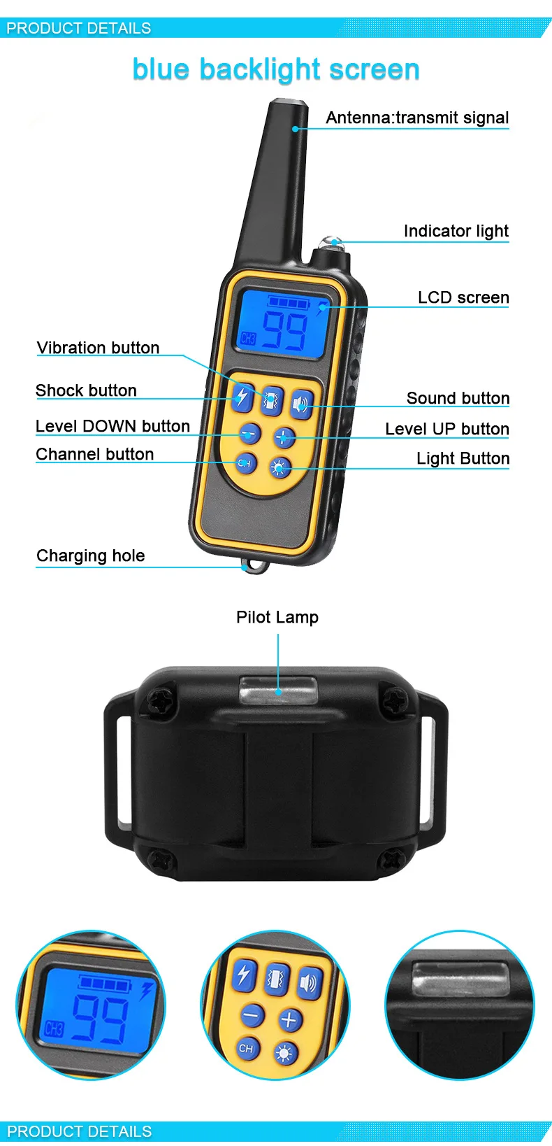 2. Регулируемый уровень: уровни вибрации и удара можно регулировать от 1 до 99. Рекомендуется постепенно попробовать уровень при первом использовании этой системы обучения питомца, чтобы найти соответствующий уровень