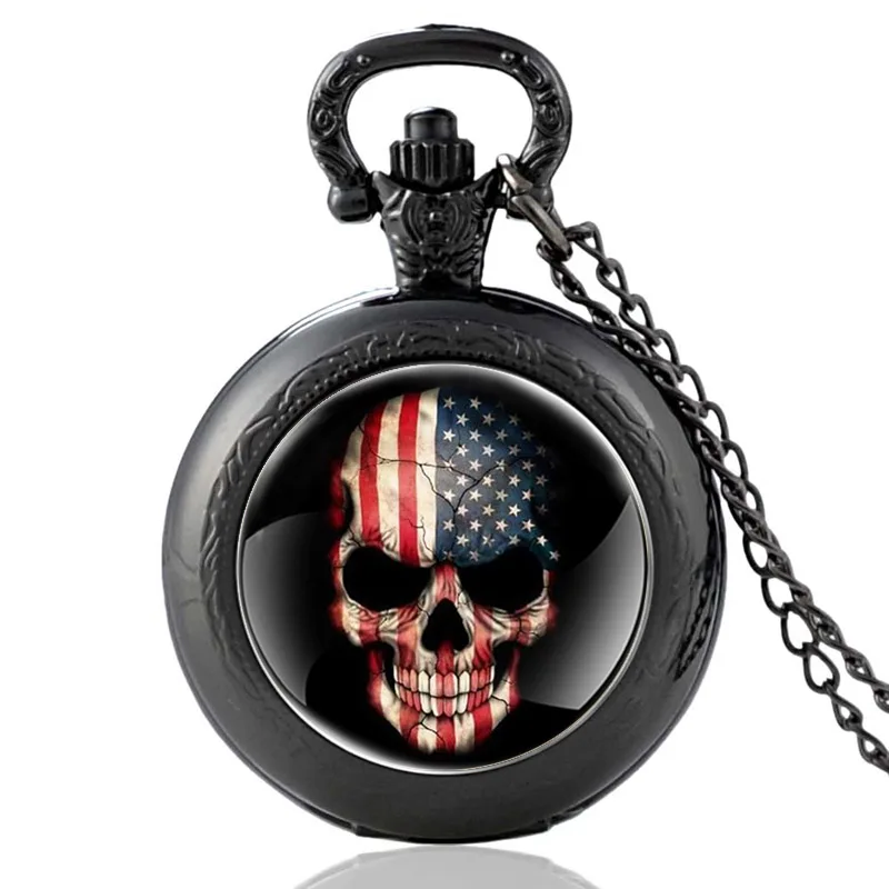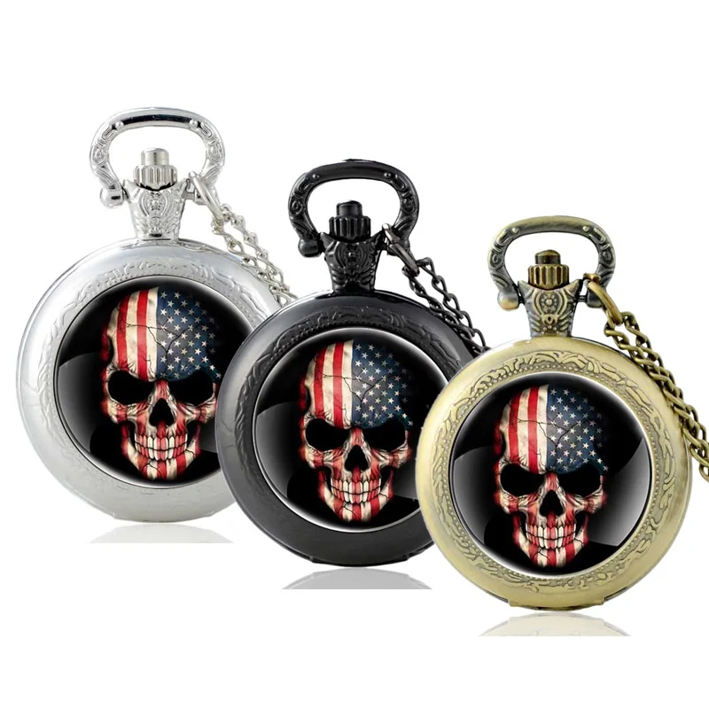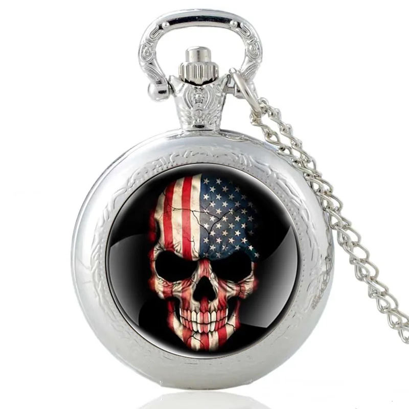Часы наручные в стиле панк, кварцевые карманные винтажные, с подвеской на цепочке, с декором американский флаг, Череп, кабошон, для мужчин и женщин, с цепочкой и скелетом
