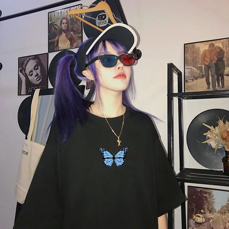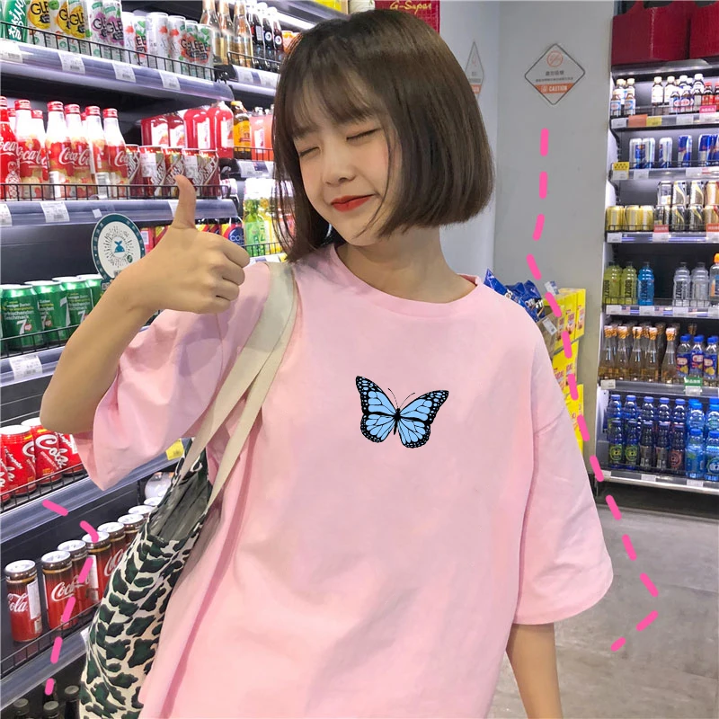 Свободные футболки большого размера Ulzzang Harajuka с принтом бабочки, повседневные летние винтажные топы, Женская забавная Милая футболка с коротким рукавом и круглым вырезом