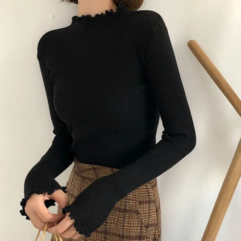 Женский трикотажный свитер-водолазка, эластичный однотонный облегающий пуловер с рюшами, весна-осень-зима 2022