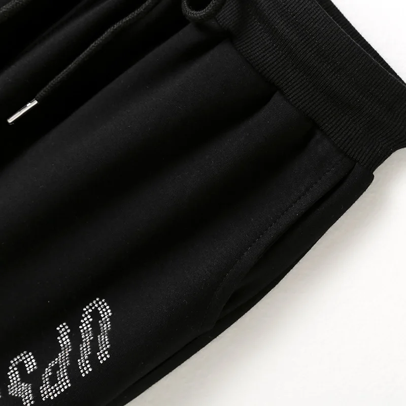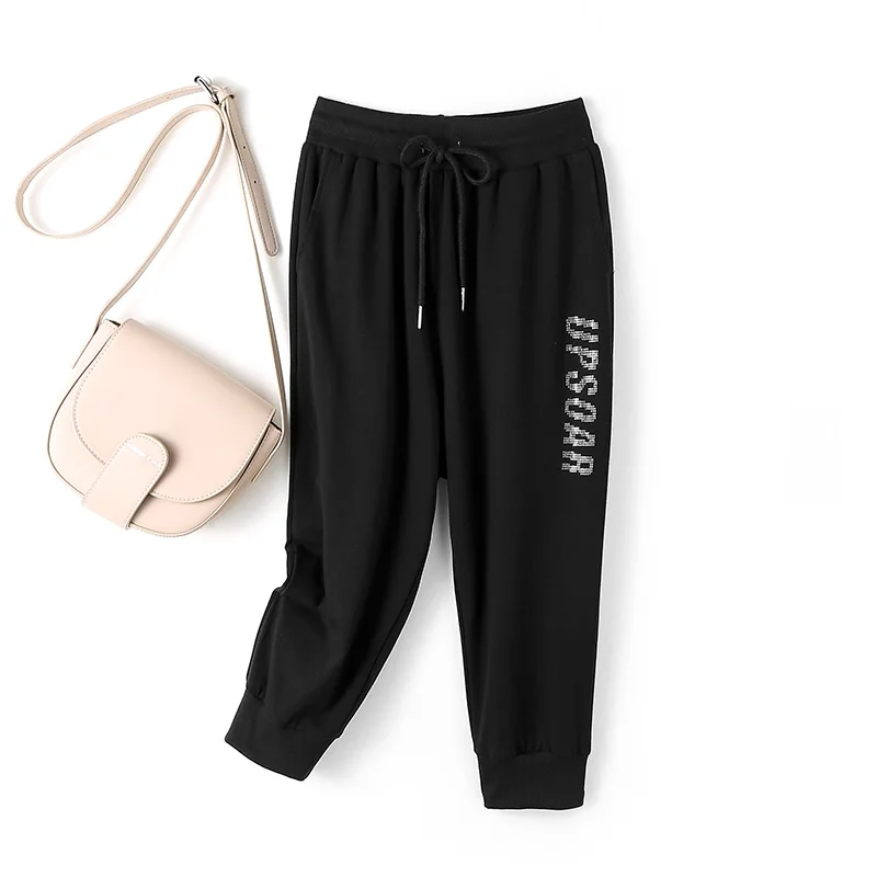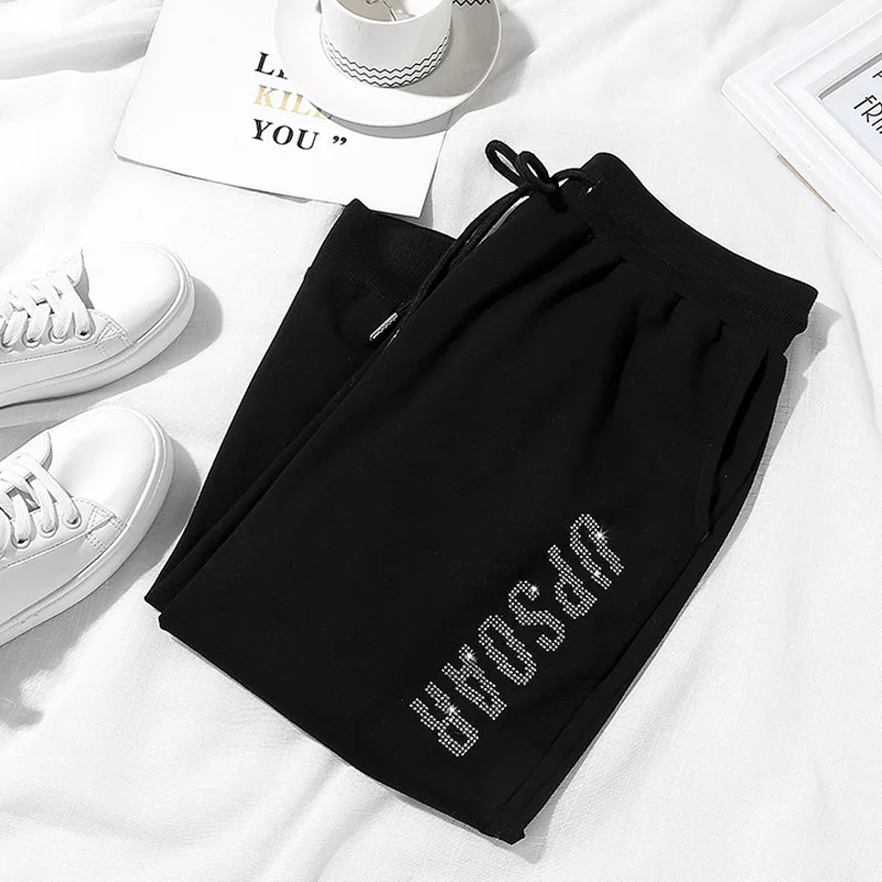Новые летние модные корейские буквы с горячими бриллиантами, брюки до теленка, женские повседневные, на шнурке, с эластичной талией, свободные женские спортивные штаны