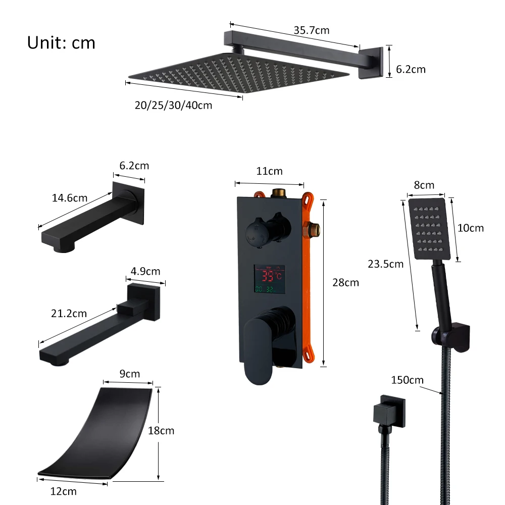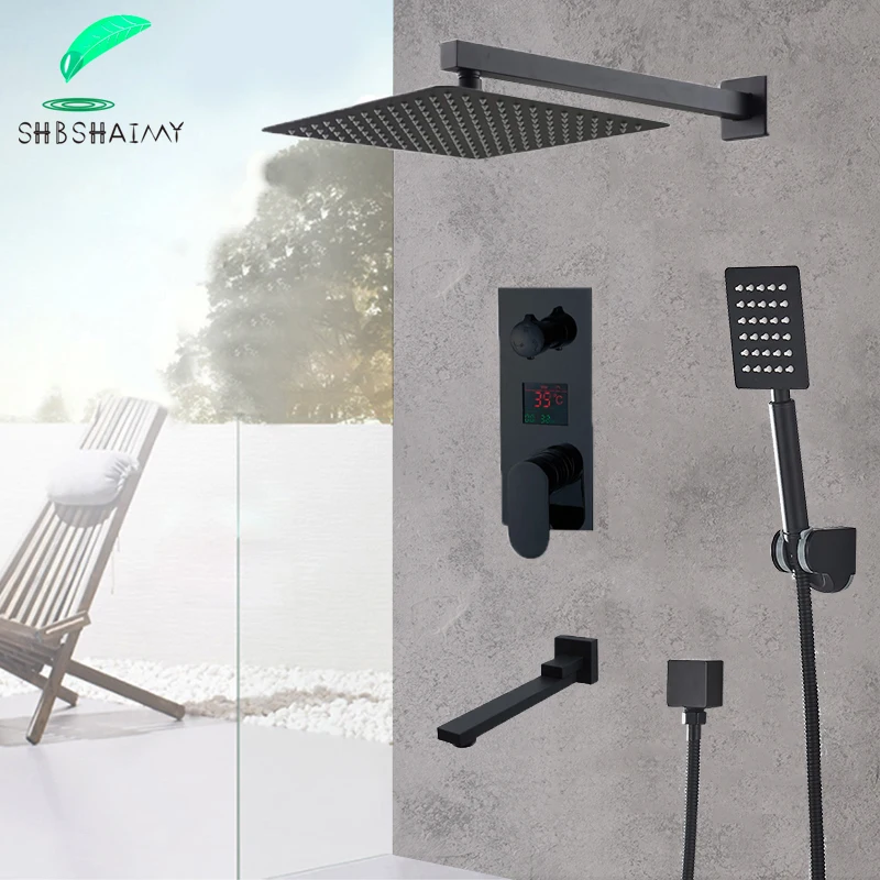 SHBSHAIMY матовый черный светодиодный смеситель для душа с цифровым дисплеем 8 "10" 12 "16" дождь водопад черная ванна смеситель горячей и холодной воды кран
