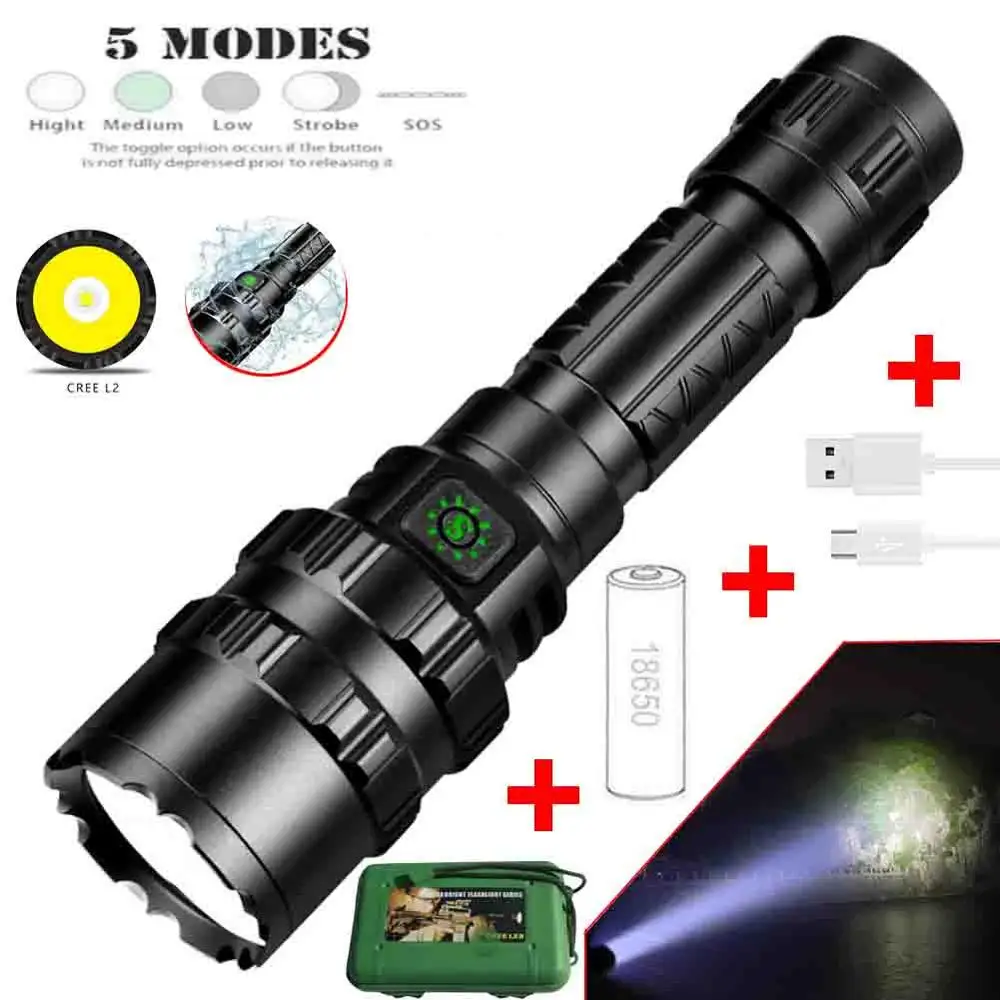 Перезаряжаемый тактический светодиодный фонарик L2 50000 лм, фонарь режимов, аккумулятор 18650 + USB-кабель + коробка 20DC04