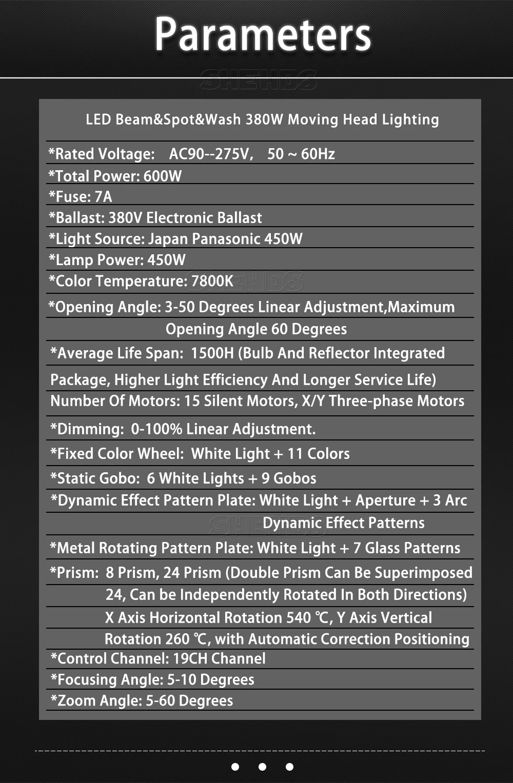 Лампа 19R 380W 3in1* Входное напряжение: 90-275 В переменного тока, 50 Гц-60 Гц* Общий Источник питания: 610 Вт* Светильник источник света: 1 шт. 380 Вт 19R лампы* Мощность лампы: 460 Вт* Предохранитель: 7а* Балласт: электронный балласт* Диммер: 0-100% линейная регулировка* Цветовая температура (CCT): 7800K* Средний срок службы: 1500 часов* DMX канал управления: 19 каналов, международный стандарт DMX512* Двигатель: всего 15 бесшумных двигателей, XY трехфазные двигатели* Призма: 8-граней, 24-граней (может быть наложен на 24, двустороннее независимое вращение)* Колесо цвета: белый + 11 цветов* Статическое колесо Gobo: 6 белых + 9 узоров* Динамическое колесо Gobo: белый + диафрагма + 3 круглых дуги с динамическим эффектом* Металлическое вращающееся колесо: белый + 7 стеклянных узоров* Материал корпуса: огнестойкий пластик* Размер изделия: 39х29х55см* Вес продукта: 22,45 кг
