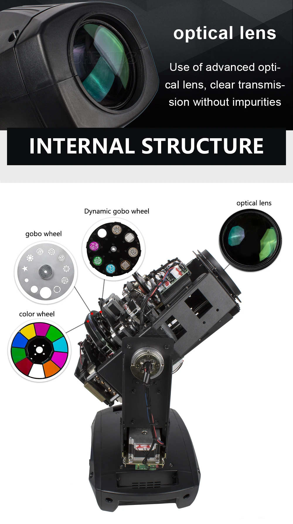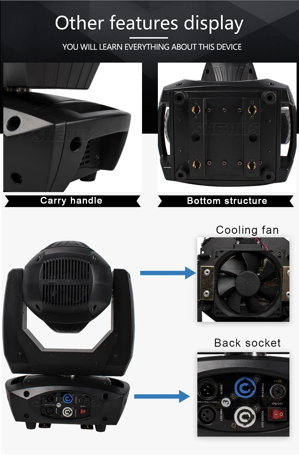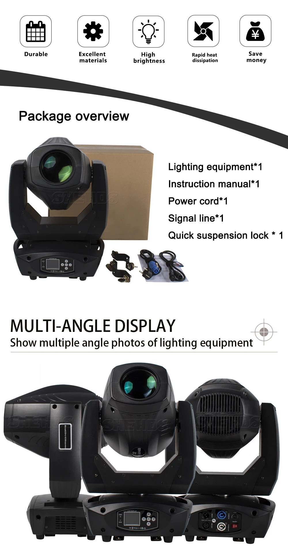 * Напряжение: AC90V ~ 275V, 50 ~ 60Hz* Режим управления: 18 каналов DMX512* Светильник источник света: 1 шт. 200 Вт белые светодиоды* Фокус: линейный фокус* Луч: эффект изменения угла многоступенчатого луча* Регулировка яркости: 0-100% линейная регулировка* Угол луча: угол параллельного луча 0 °-2,3 °* Угол распыления светильник 8 °* Стробоскоп: 1-25 Гц с импульсным эффектом* Цветовая температура: 7500k* Срок службы светодиодов: в среднем 5000 часов* Цветной диск: 9 цветов цвет s + белый светильник* Диск с узором: 1 вращающийся диск с узором + 1 металлический диск с узором* Шаблон диска Призма: 1 Призма и 4 стороны* Световой поток: 20 м/186700lux 40 м/48175lux 60 м/20855lux* Диапазон проекции: 540 градусов в X направлении, 270 градусов в Y направлении, Автоматическая коррекция и позиционирование* Скорость сканирования: 3,0 секунд/540 градусов в направлении X, 2,0 секунд/250 градусов в направлении Y• Вес нетто: 14,5 кг* Вес Grose: 23 кг