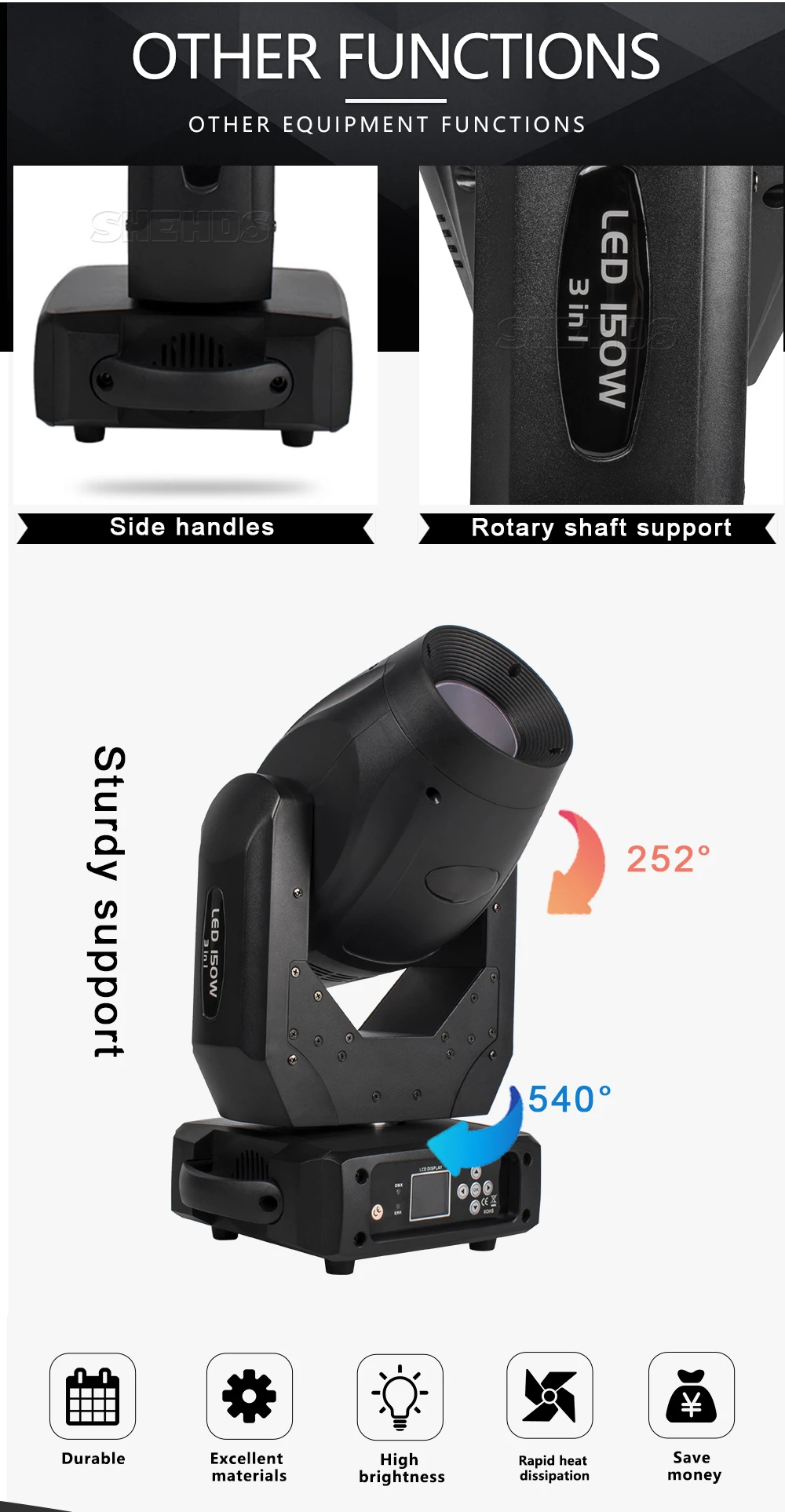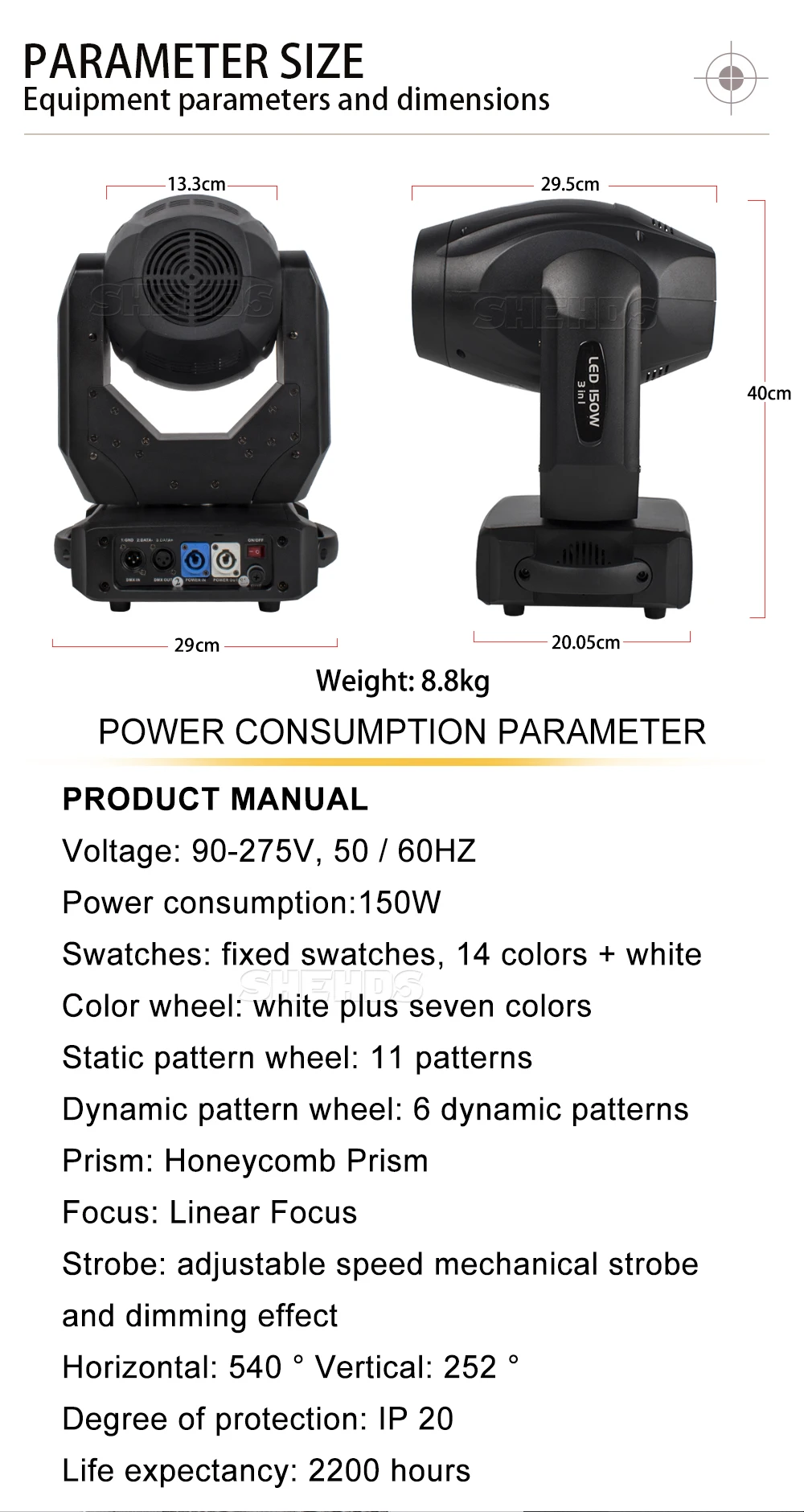* Напряжение: AC90-275V В переменного тока, 50/60 Гц* Потребляемая мощность: 150 Вт* Светильник источник: 1pcs150W белых светодиодов* Цветовая температура: 7500k* Срок службы светодиодов: Avereage 5000 часов* Угол луча: угол параллельного луча 0 °-2,3 °* Угол распыления светильник 8 °* Стробоскоп: 1-25 Гц с импульсным эффектом* Регулировка яркости: 0-100% линейная регулировка* Луч: эффект изменения угла многоступенчатого луча* Режим управления: 18 международных стандартов DMX512CH* Цветной диск: 7 цветов цвет s + белый светильник* Диск с узором: 1 вращающийся диск с узором + 1 металлический диск с узором* Шаблон диска Призма: 1 Призма и 3 стороны* Световой поток: 20 м/186700lux 40 м/48175lux 60 м/20855lux* Внешний вид: термостойкий пластиковый корпус, высокопрочный сплав холодного отжима* Фокус: линейный фокус* Диапазон проекции: 540 градусов в X направлении, 270 градусов в Y направлении, Автоматическая коррекция и позиционирование* Сканирование Скорость: 3,0 секунд/540 градусов в направлении X, 2,0 секунд/250 градусов в направлении Y• Вес нетто: 14,5 кг* Вес Grose: 23 кг