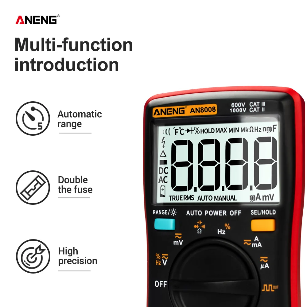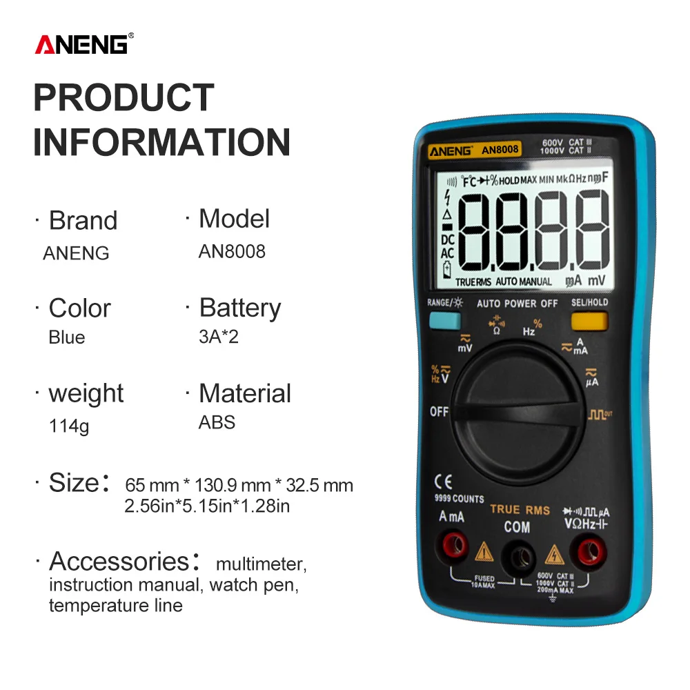 ANENG AN8008-это первый в мире цифровой мультиметр с 9999 отсчетами пальмового размера, работающий автоматически.