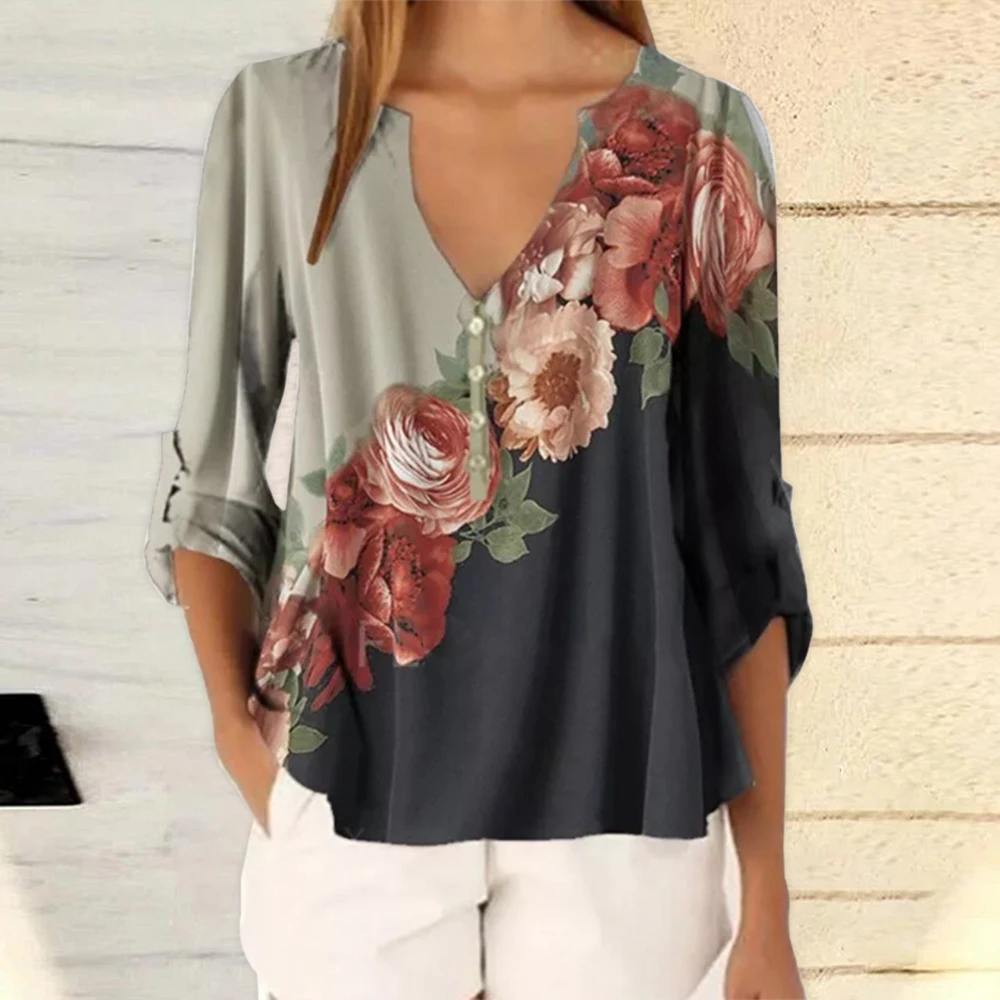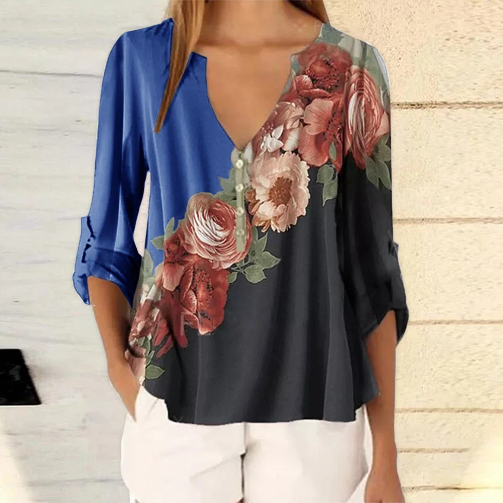Женская футболка с цветочным принтом, V-образным вырезом и рукавом до локтя