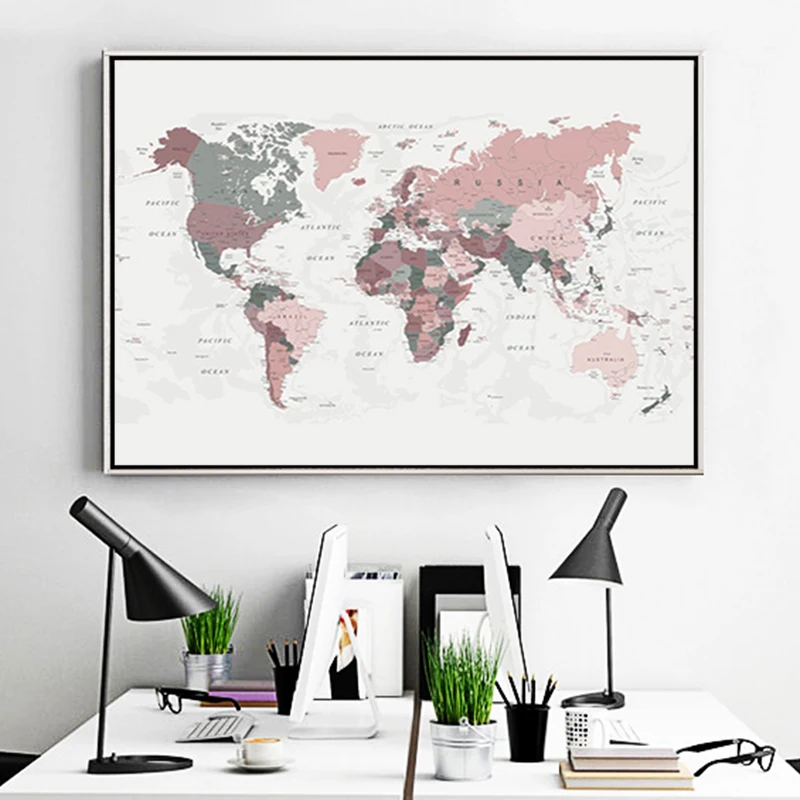 Карта мира Печать на холсте румянец розовый и Охотник зеленая карта мира Плакат Общежитие Декор Современная Настенная картина украшение