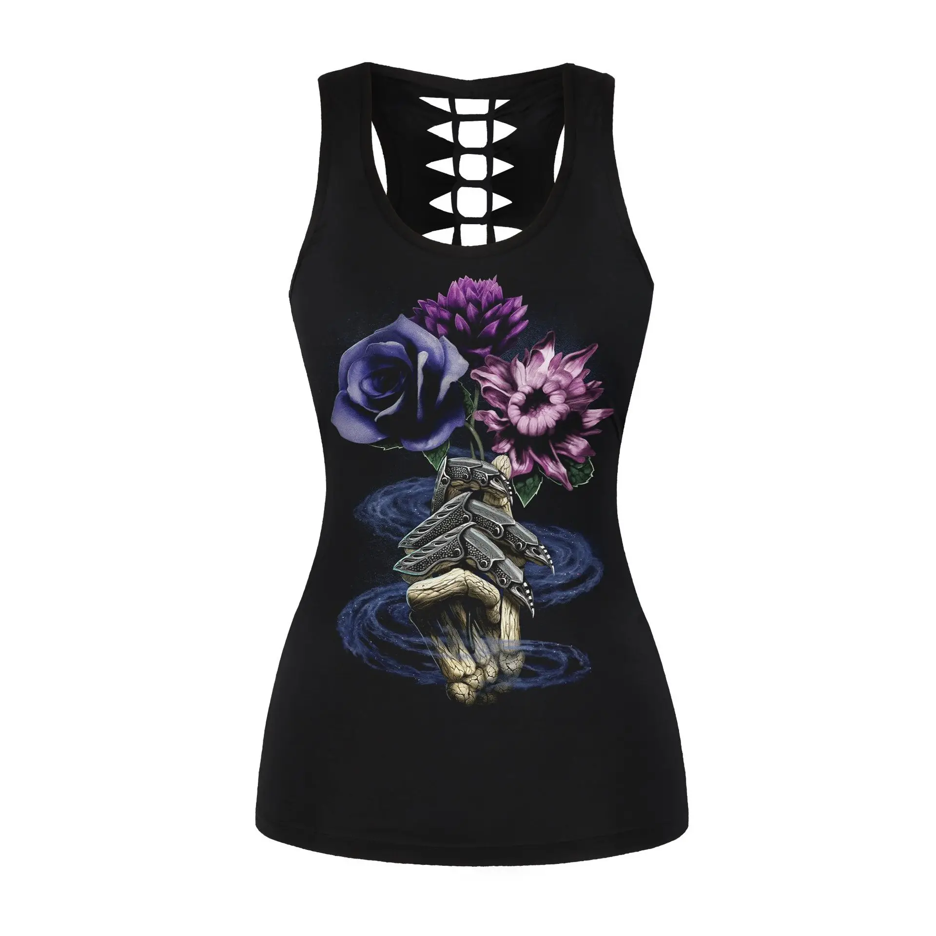 3D принт череп скелет роза задняя открытая майка Топы для женщин панк ужас кости тонкий u-образный вырез без рукавов Футболка Хэллоуин Вечерние