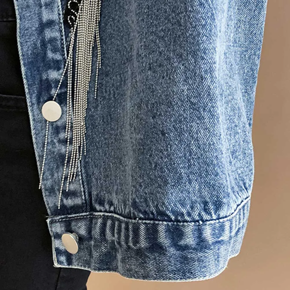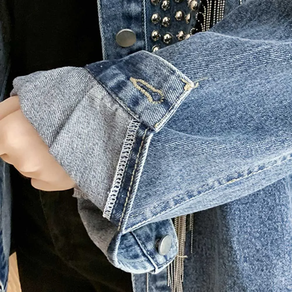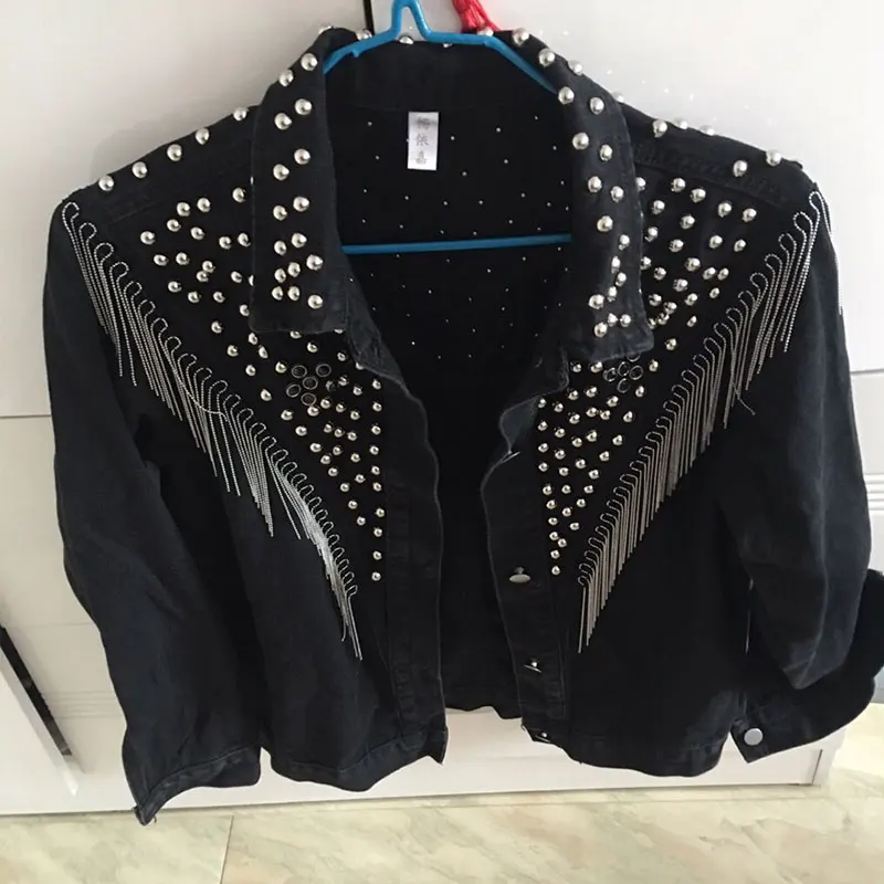 Куртка женская джинсовая с кисточками и заклепками, Модный Черный Топ с длинным рукавом, свободная уличная одежда в стиле панк, XL, весна-осень 2021
