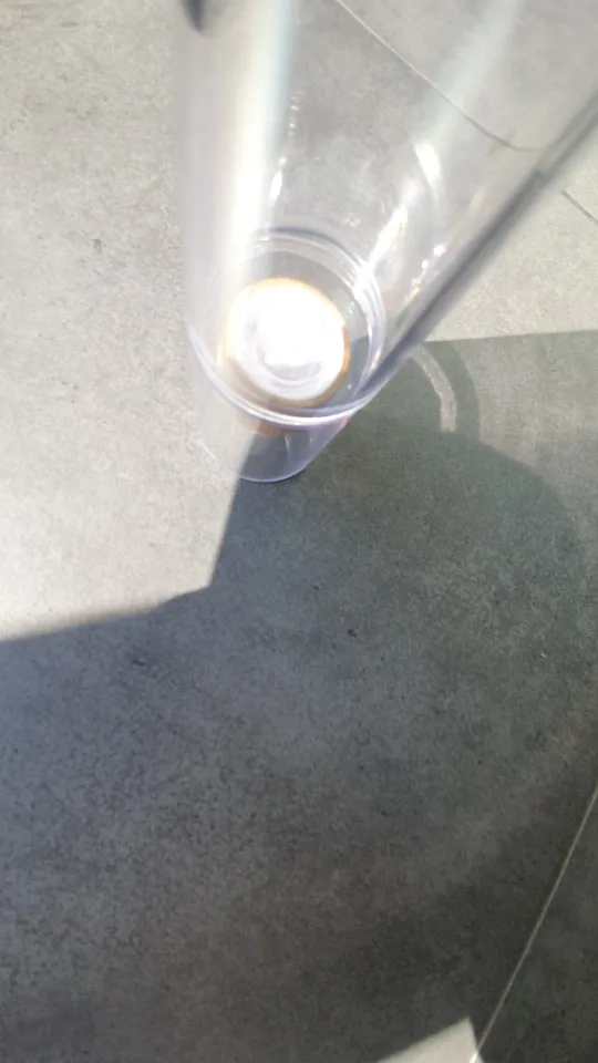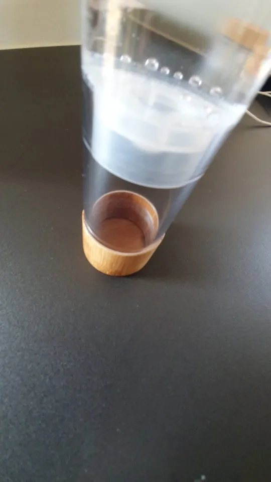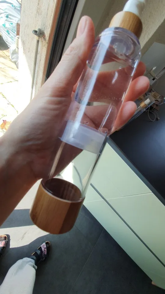 Пластиковая бутылка без царапин. Настоящая бамбуковая оболочка. Работает хорошо. Никакой жидкости не проходит под пластиковым основанием. Прибыл очень, очень, очень хорошо упакованный, за месяц до запланированной даты в Швейцарии. Я рекомендую это.