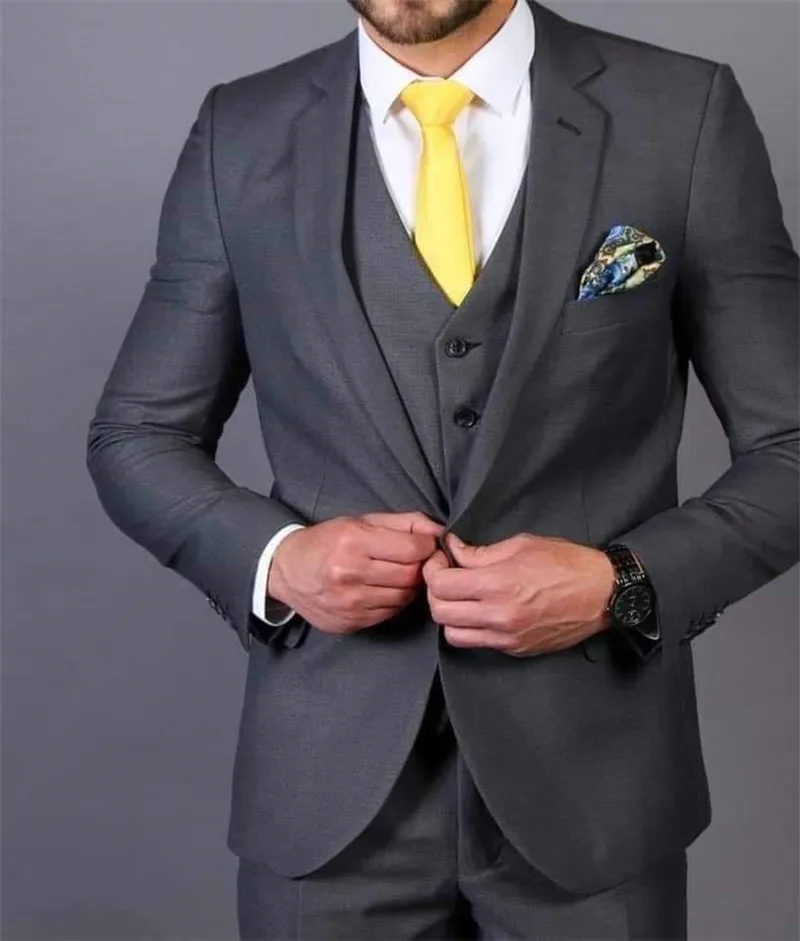 Приталенный смокинг для жениха на одной пуговице темно-серый мужско...