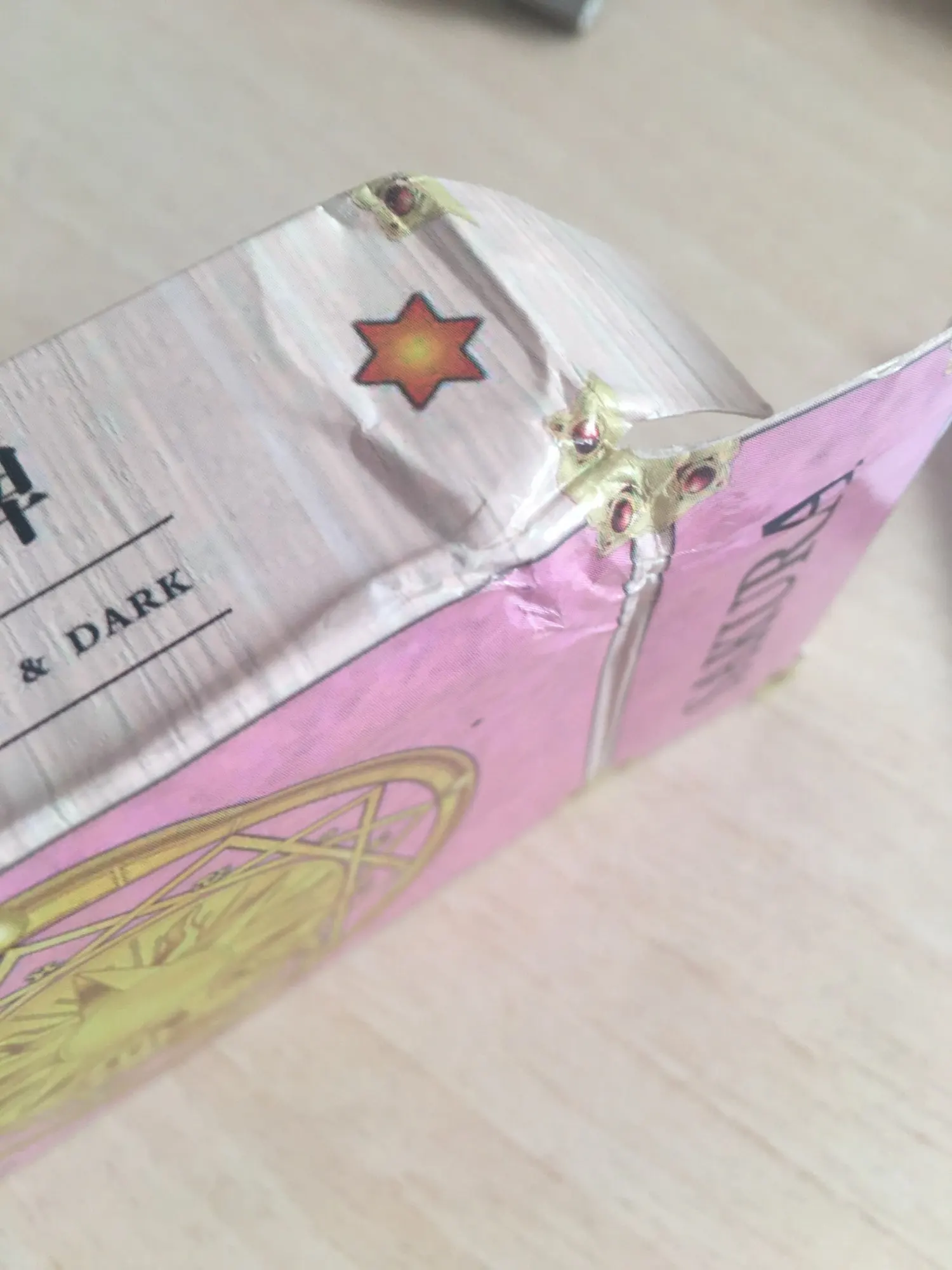 Коробка была немного повреждена снаружи, углы были согнуты и закруглены, а надпись на коробке была немного Пиксельной и низкого качества. Но настоящие карты были очень хороши и высокого качества! Приятная, гладкая и матовая текстура, с четким принтом. У него также были некоторые торговые карты.
