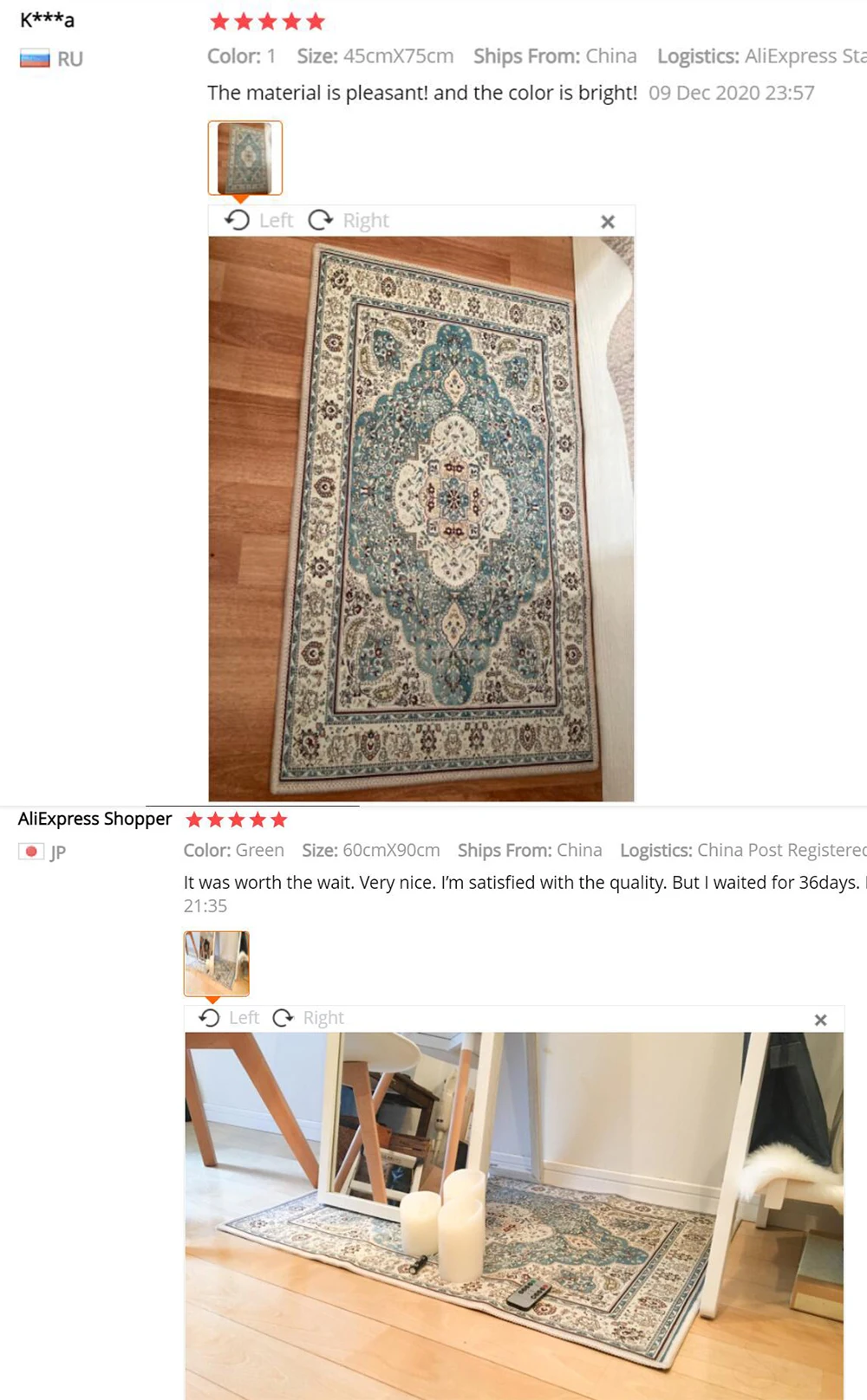 В: есть ли у вас реальные фотографии?О: Да, если вам нужно, пожалуйста, свяжитесь с нами.В: если вам это не нравится, как вернуть товар?О: мы вернем покупателям деньги, если покупатели возвращают товары в течение 15 дней с момента получения покупателями товаров по любой причине. Тем не менее, покупатели должны нести стоимость обратной доставки и убедиться, что возвращенные товары находятся в их первоначальном состоянии.Вопрос: Что делать, если вы хотите большой ковер?О: пожалуйста, свяжитесь с нашей службой поддержки клиентов напрямуюВ: какая логистика используется для доставки?О: товары отправляются стандартной доставкой AliExpress, авиапочтой Китая, Премиум доставкой AliExpress, ePacket, доставляются в большинство стран в течение 15-35 рабочих дней. Время доставки зависит от пункта назначения и других факторов, это может занять до 60 рабочих дней.Если вы хотите получить товар быстрее, пожалуйста, свяжитесь с нами, чтобы оплатить дополнительные перевозки, мы можем предложить вам следующие более быстрые и дешевые способы доставки: UPS , DHL , Fedex , TNT , DEPX , EMS. С помощью этих способов вы можете получить товар в течение 5-7 рабочих дней.
