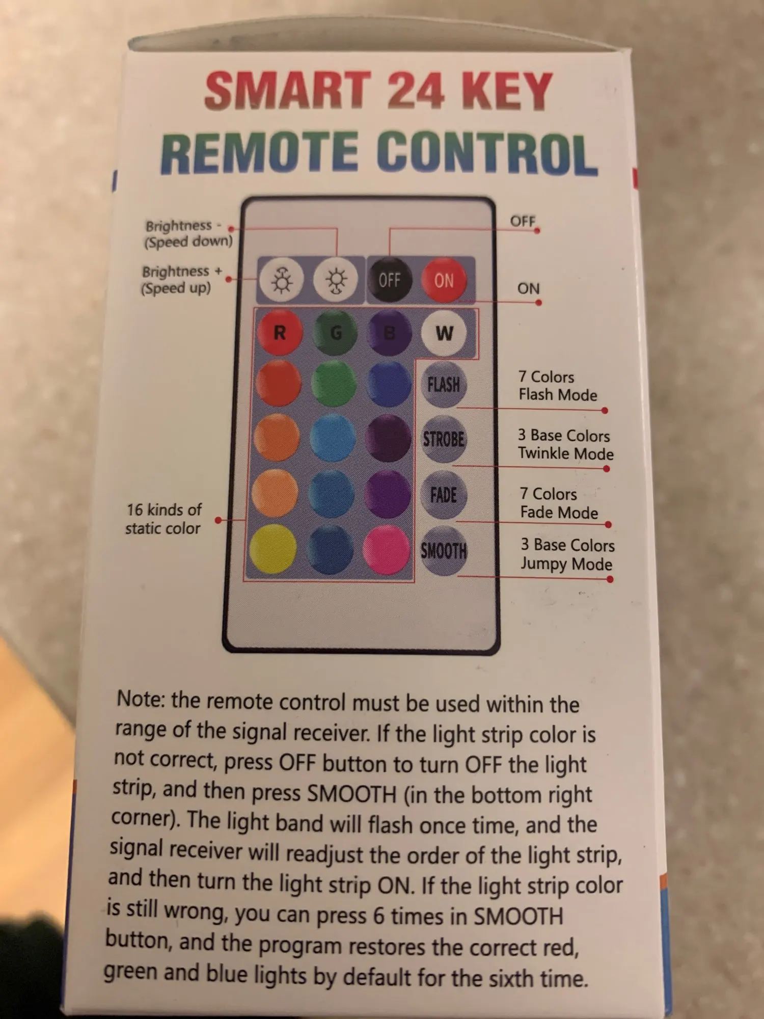 Продукт, как говорится в описании. Он работает очень хорошо, и вы можете управлять цветами с помощью контроллера (на коротком расстоянии света), очень хорошее соотношение цены и качества.