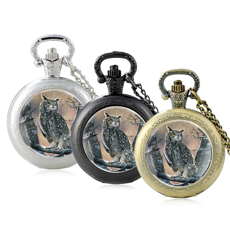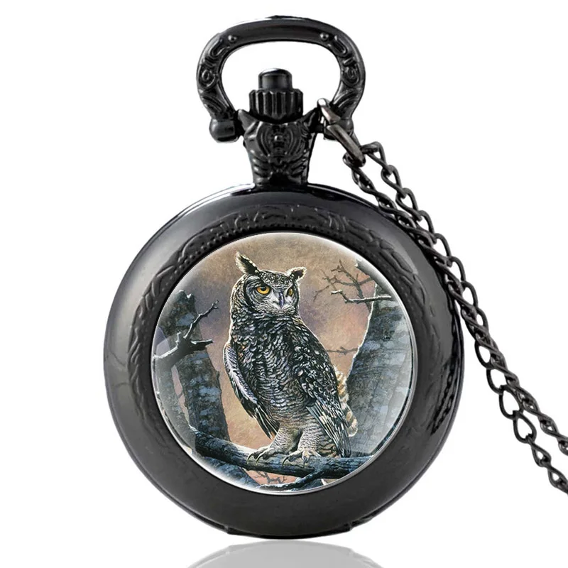 Новое поступление 2020, стеклянный кабошон в виде совы, кварцевые карманные часы, винтажные мужские и женские черные часы с кулоном и цепочкой, часы