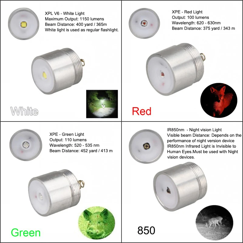4 различных цвета светильник s включены в охотничий набор-красный светильник, белый светильник, зеленый светильник и IR850nm светильник, может удовлетворить все потребности, когда вы ищете различные цели в различных охотничьих ситуациях. Модули легко загружать и разгружать.Корпус из алюминиевого сплава, анодированный для долговечности, непромокаемый. Этот охотничий фонарик предназначен для охоты на койотов, свиней, бобов и т. д.Режимы: 1Ток: 1.5AРаботают Напряжение: 3,7-8,4 VБатареи: 1 литий-ионный аккумулятор 18650 (опционально)Размеры:Длина 7,29 "(160 мм), диаметр головки 1,65"(42 мм), диаметр корпуса: 1 "(25,5 мм)XPE-красный светильникВыход: 100 люменовДлина волны: 620 - 630nmРасстояние луча: 375 ярдов/343 мМы настоятельно рекомендуем использовать красные огни для хищников. Хищники, скорее всего, будут путаны красным светильник.XPE-зеленый светильникВыход: 110 люменовДлина волны: 520 - 535 нмРасстояние луча: 452 ярдов/413 мХоги имеют цвет слепых и красный или зеленый не беспокоят их, но Хог, как правило, темный цвет и гораздо труднее видеть с красным. Вот почему зеленый цвет является предпочтительным выбором для хогов. Зеленый светильник гораздо проще для человеческого глаза, чем красный светильник, поэтому большинство людей выбирают зеленый.XPL V6-белый светильникМаксимальная мощность: 1150 люменРасстояние луча: 400 ярдов/365 мБелый светильник используется как обычный флэш-светильник.IR850nm-светильник ночного виденияРасстояние видимого луча: зависит от производительности устройства Ночной версииИнфракрасный светильник IR850nmНевидимый для глаз человека. Должен использоваться с устройствами ночного видения.Посылка включает в себя:1X корпус фонарика1X XPE красный светильник1X XPE зеленый светильник1X XPL V6 белый светильник1X ИК 850нм модуль