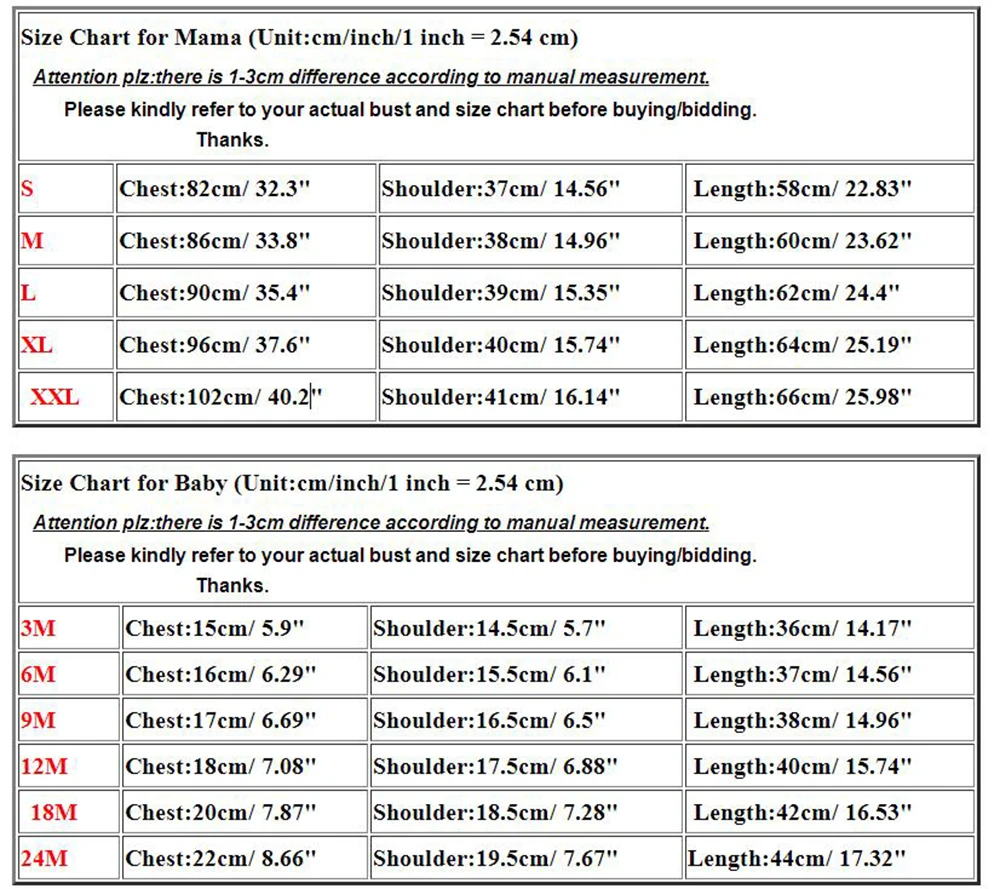 Таблица размеров для мамы (единица измерения: см/дюйм/1 дюйм = 2,54 см) Обратите внимание: возможны отклонения в 1-3 см из-за ручного измерения.Пожалуйста, ознакомьтесь с фактическим бюстом и таблицей размеров перед покупкой/размещением заявки. Спасибо.SГрудь: 82 см/32,3 дюйма"Плечо: 37 см/14,56"Длина: 58 см/22,83"МГрудь: 86 см/33,8 дюйма"Плечо: 38 см/14,96"Длина: 60 см/23,62"LГрудь: 90 см/35,4 дюйма"Плечо: 39 см/15,35 дюймаДлина: 62 см/24,4"XLГрудь: 96 см/37,6 дюйма"Плечо: 40 см/15,74"Длина: 64 см/25,19"XXLГрудь: 102 см/40,2 дюйма"Плечо: 41 см/16,14 дюймаДлина: 66 см/25,98 дюйма"Таблица размеров для ребенка (единица измерения: см/дюйм/1 дюйм = 2,54 см) Обратите внимание: возможны отклонения в 1-3 см из-за ручного измерения.Пожалуйста, ознакомьтесь с фактическим бюстом и таблицей размеров перед покупкой/размещением заявки. Спасибо.3 мГрудь: 15 см/5,9 дюйма"Плечо: 14,5 см/5,7"Длина: 36 см/14,17"6 мГрудь: 16 см/6,29 дюйма"Плечо: 15,5 см/6,1 дюймаДлина: 37 см/14,56"9 мГрудь: 17 см/6,69 дюйма"Плечо: 16,5 см/6,5 дюймаДлина: 38 см/14,96"12 мГрудь: 18 см/7,08 дюйма"Плечо: 17,5 см/6,88 дюймаДлина: 40 см/15,74"18MГрудь: 20 см/7,87 дюйма"Плечо: 18,5 см/7,28 дюймаДлина: 42 см/16,53 дюйма"24 мГрудь: 22 см/8,66 дюйма"Плечо: 19,5 см/7,67 дюймаДлина: 44 см/17,32"
