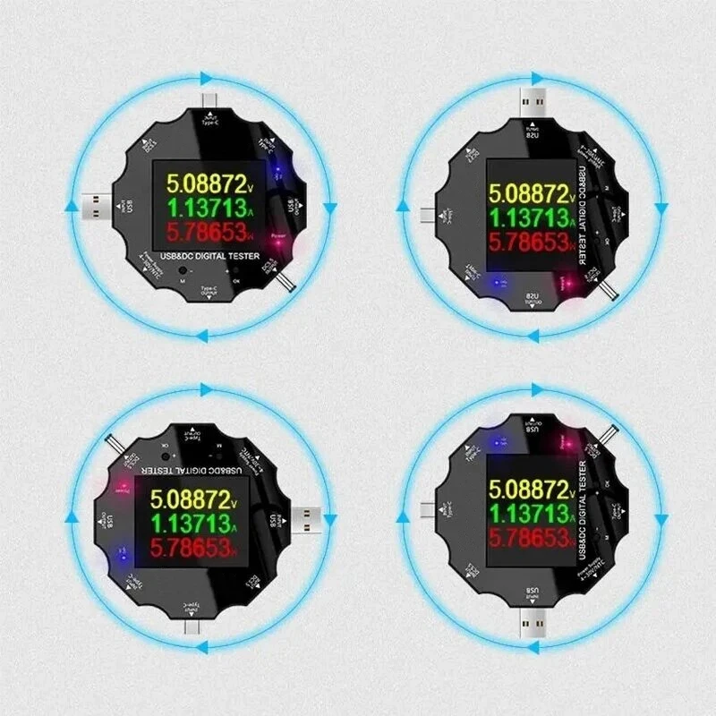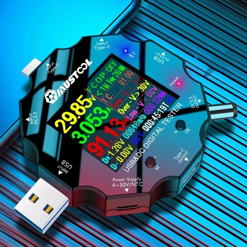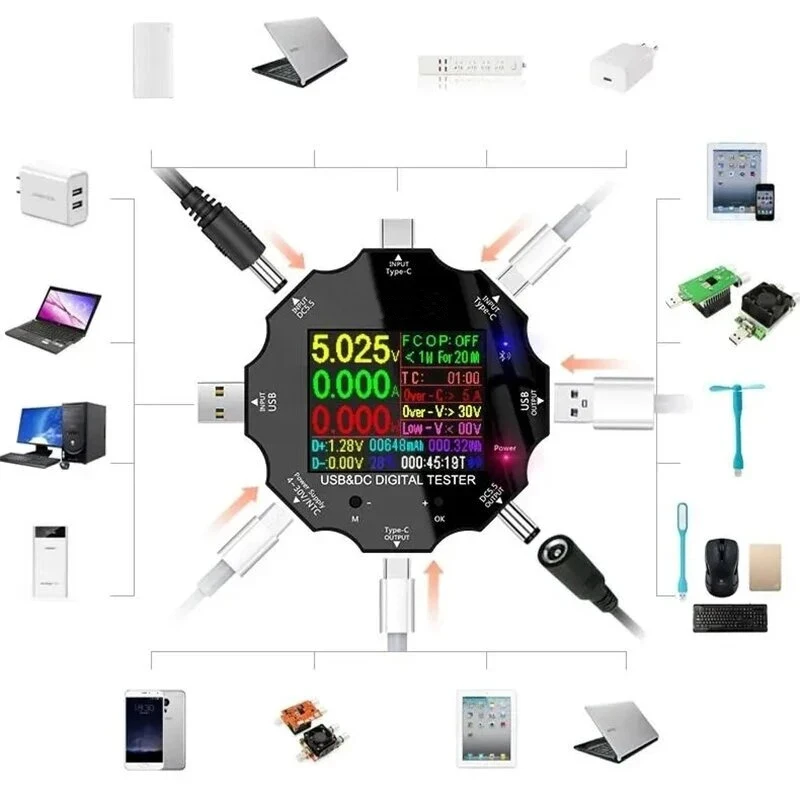 Это новый продукт! Цветной экран! Bluetooth! 8 интерфейсов! Поддержка USB, type-C, DC5525, micro USB. Он может измерять изменения напряжения и тока в процессе работы/зарядки различных инверторов постоянного тока, таких как мобильные телефоны, ноутбуки, настольные лампы, роутеры, приставки и т. д. И может быть изучен по Bluetooth на мобильном телефоне!