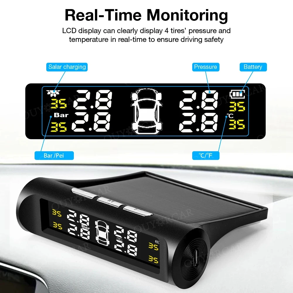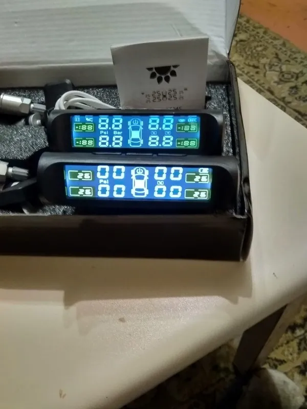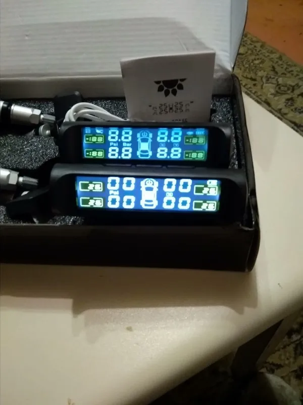 отличная система контроля давления в шинах. купил сначала с наружными датчиками. работали исправно пока не продал машину. на новую машину купил 2 комплекта с внутренними датчиками. для двух комплектов колёс. все-таки меньше шансов что сраные малолетки украдут. давление и температуру показывают. от солнечной панели заряда хватает надолго. включается прибор при запуске двигателя или от хлопка дверями. после нескольких минут покоя прибор уходит в сон. потом продал комплект колёс с датчиками, купил другой комплект и к нему ещё комплект датчиков. упаковано не очень качественно, но обошлось без повреждений. прибор заказанный позже чуть отличается от образца. доставка быстрая.
