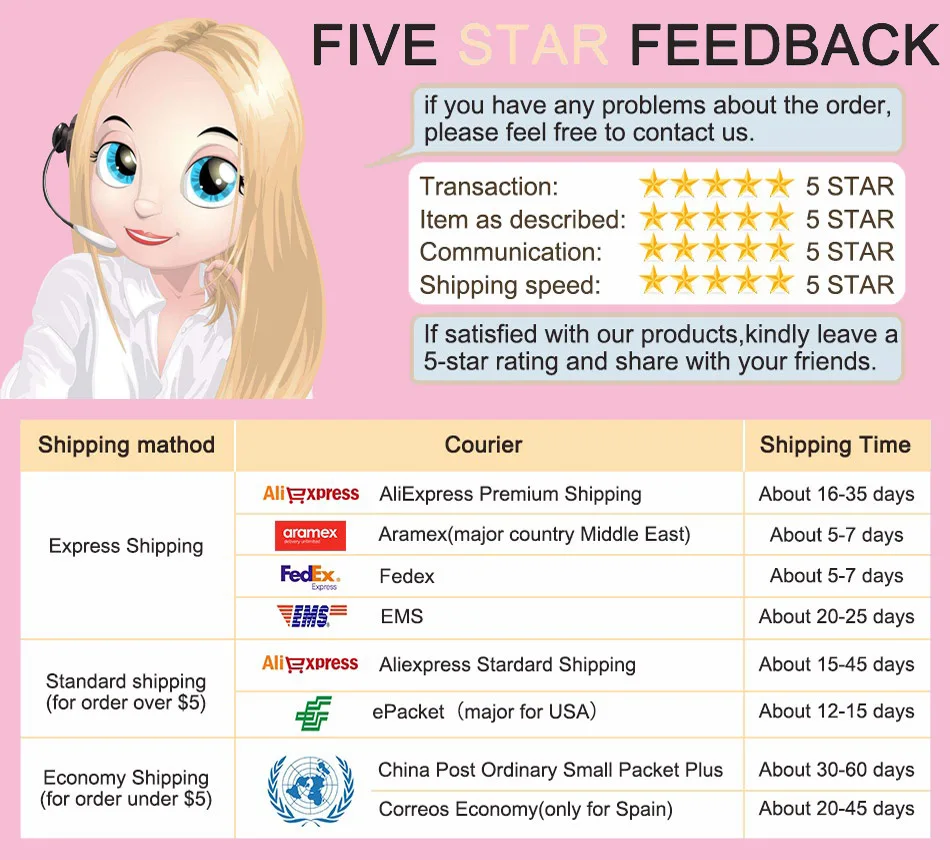 Promise:1. Delivery within 2 days.2. Products have any quality problems, please contact us from Aliexpress message, We will resolve for you.3. If you didn't receive the product, free resend or full refund.