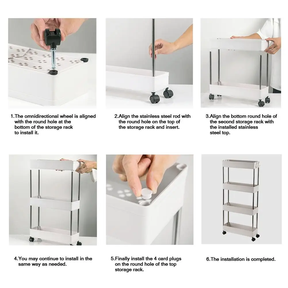1. Стержень из нержавеющей стали, прочный и трудно ржавеет, не легко сломать2. Требует легкой сборки3. Простой дизайн легко поместится в различные стили домашнего декора4. Четыре вращающихся колеса 360 градусов для удобства подвижности5. Добавьте дополнительный счетчик и место для хранения в вашу кухню или столовуюХарактеристики (о):Название: тонкая корзина для храненияМатериал: ПП + нержавеющая стальЦвет: белыйРазмер:3 уровня: 64*40*13,2 см/25,20*15,75 * 5.20in4-ярусный выставочный стенд: 96*40*13,2 см/37,80*15,75 * 5.20inПрименение: ванная комната, кухня, гостиная и т. Д.Способ установки:1. Всенаправленное колесо выровнено с круглым отверстием в нижней части стеллажа для хранения, чтобы установить его.2. Выровняйте стержень из нержавеющей стали с круглым отверстием на верхней части стойки для хранения и вставьте.3. Выровняйте нижнее круглое отверстие второй стойки для хранения с установленной верхней частью из нержавеющей стали.4. Вы можете продолжать устанавливать так же, как это необходимо.5. Наконец Установите 4 карты на круглое отверстие верхней стойки для хранения.6. Установка завершена.Упаковочный лист (по желанию):1*3 ярусная тонкая корзина для храненияУпаковочный лист (по желанию):1*4 ярусная тонкая корзина для хранения
