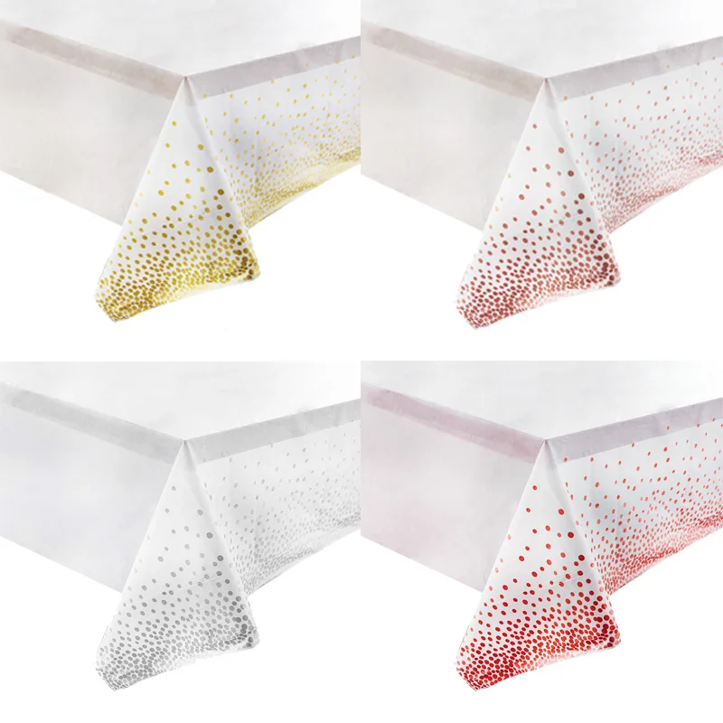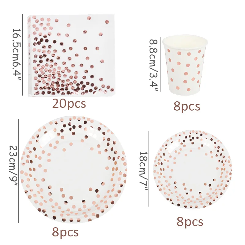 Материал: пищевая бумагаДизайн: розовое золото, Круглый ГорошекКубок: около 7.5x8.5x5cmПластина: 7 дюймовСалфетки: 33x33cmСкатерть: 275x141cm