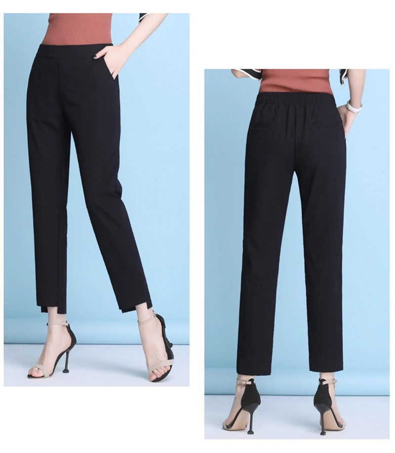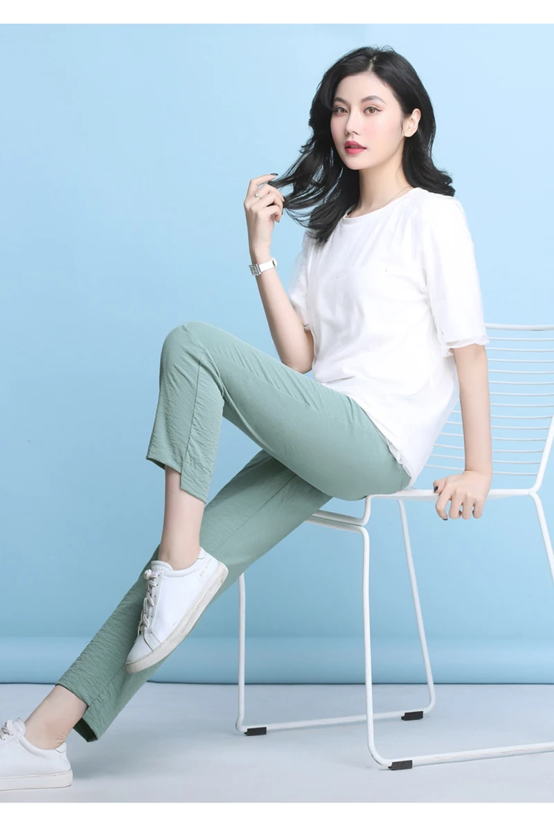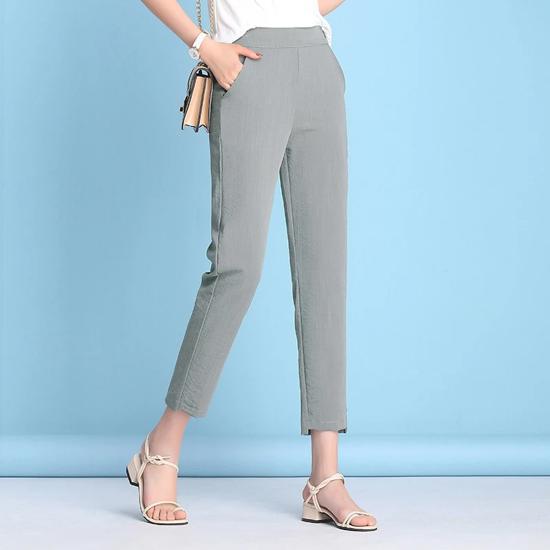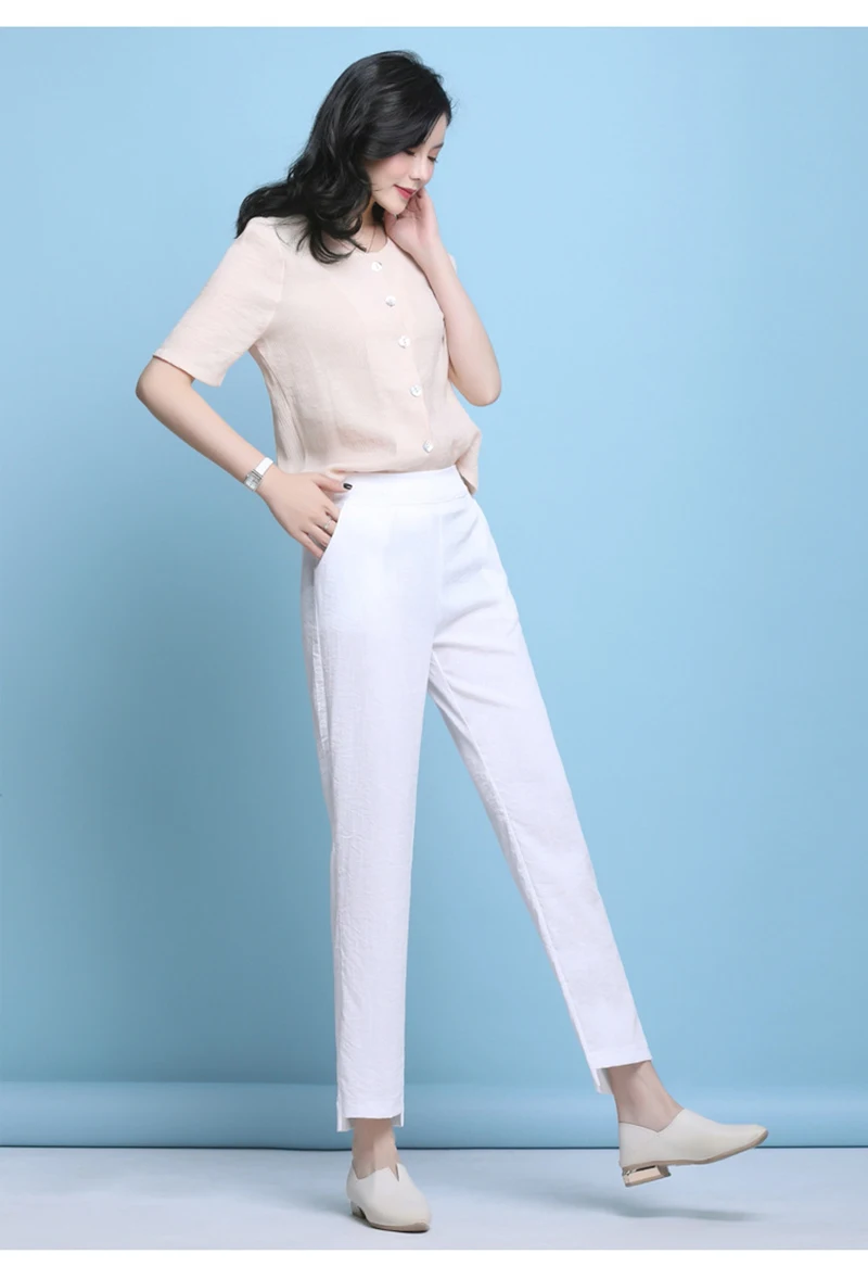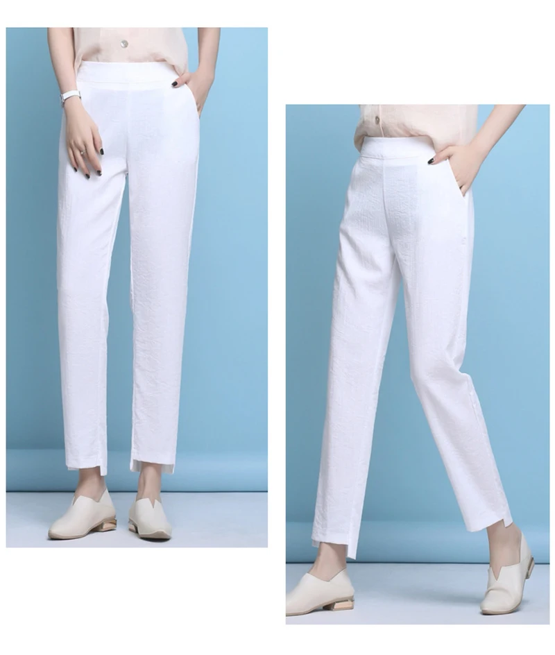 Брюки женские хлопково-льняные до щиколотки, Тонкие штаны с эластичным завышенным поясом, лето 2020