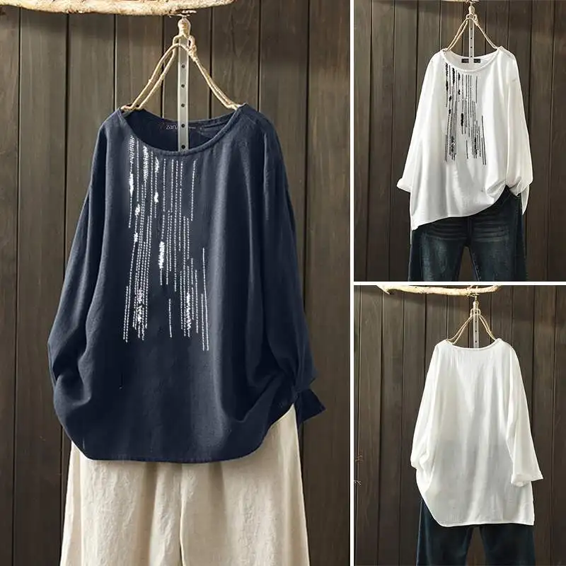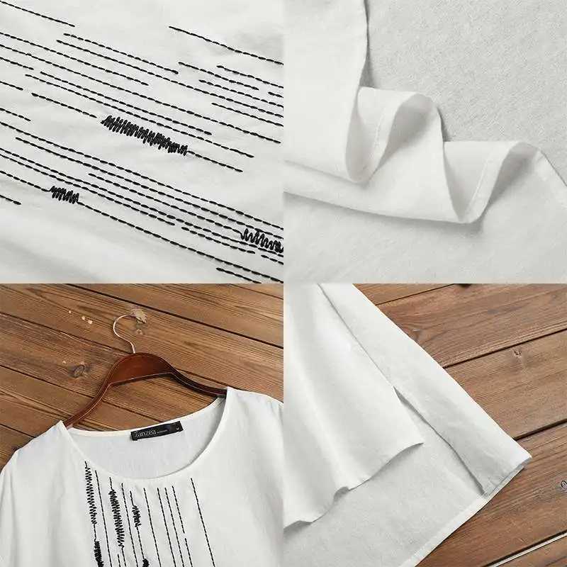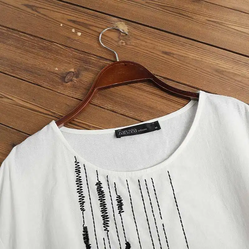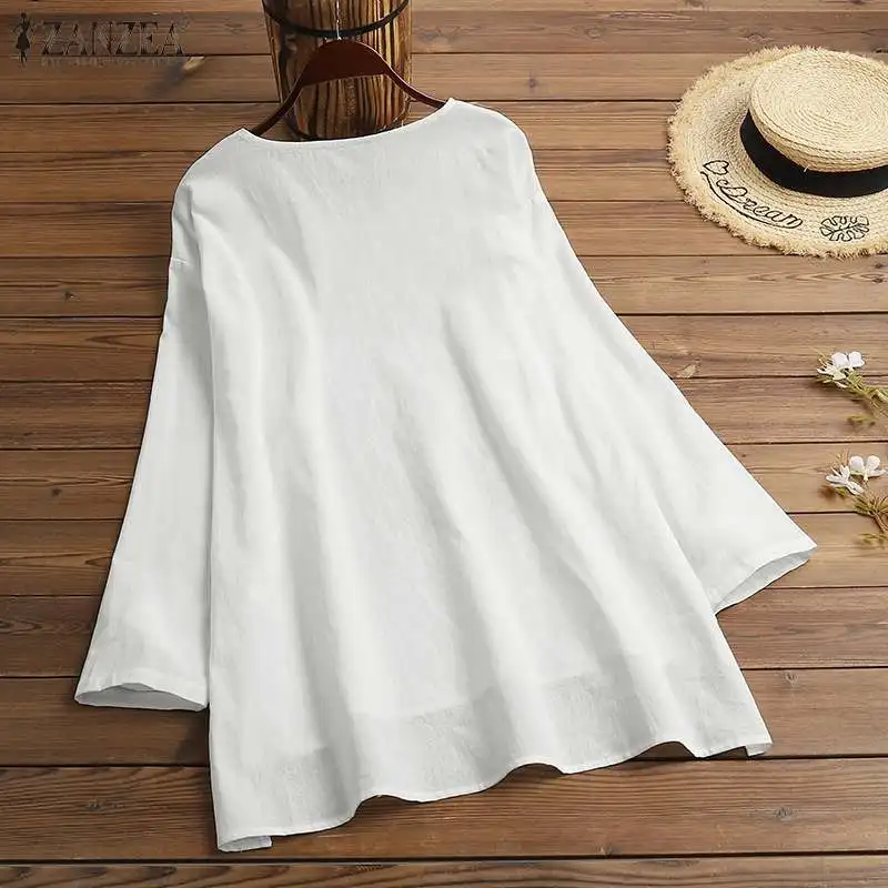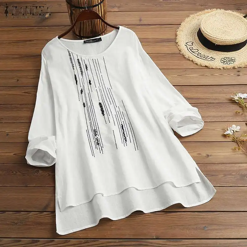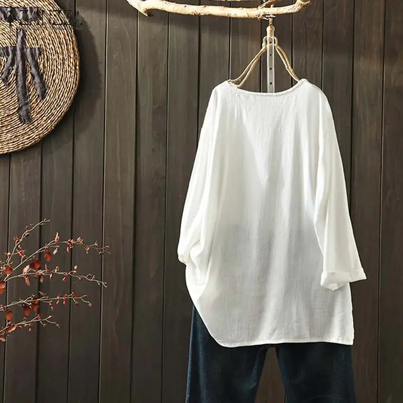 Блузка ZANZEA женская с вышивкой, повседневная винтажная блузка из хлопка и льна, с круглым вырезом и длинным рукавом, осень 2021